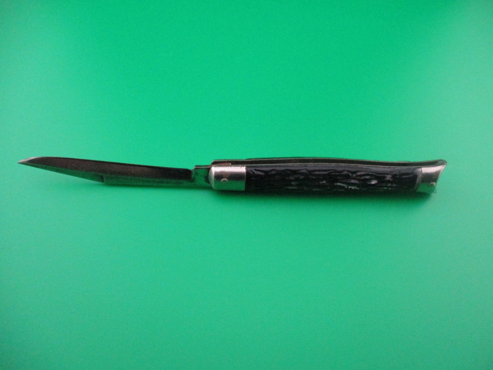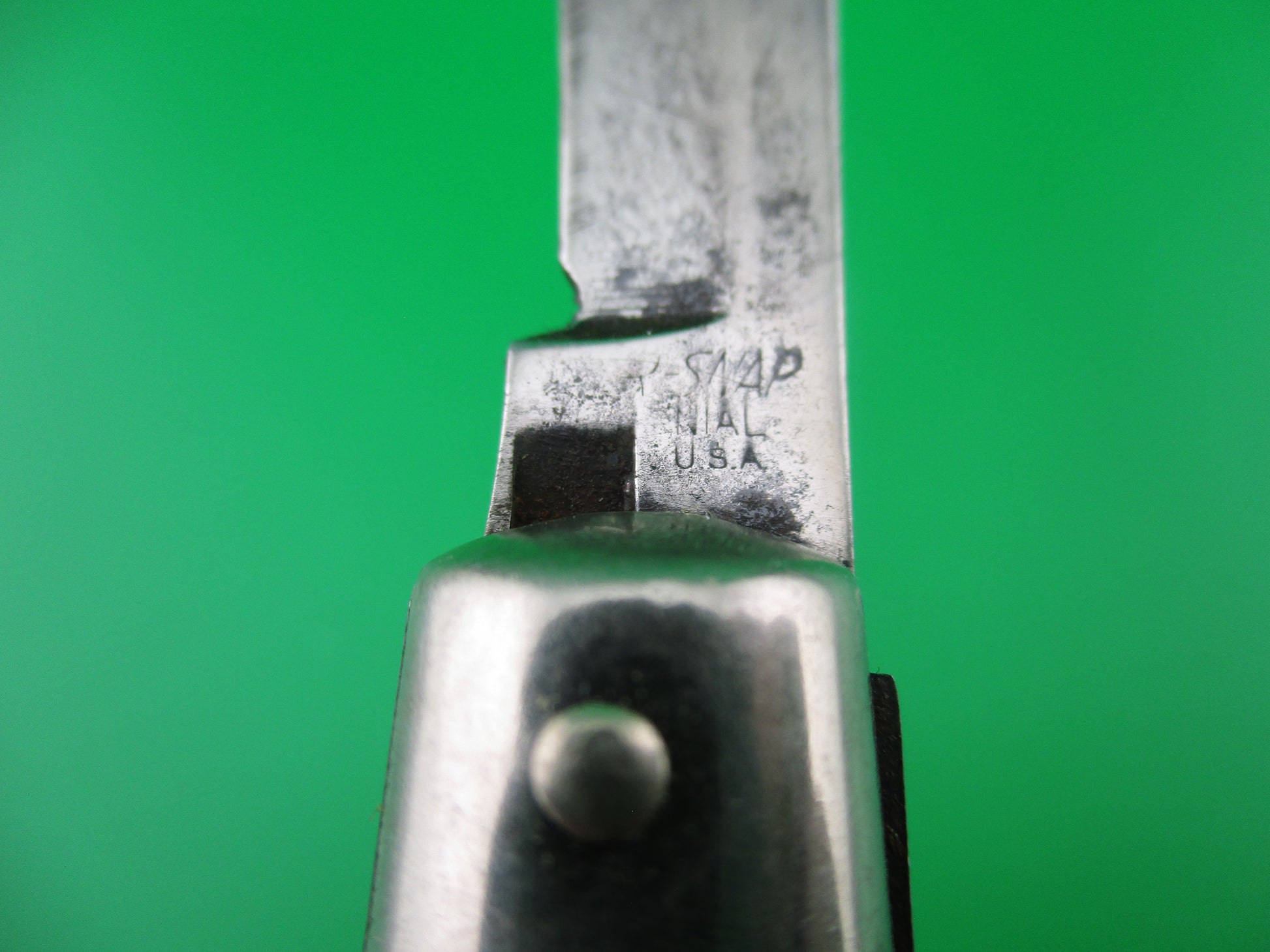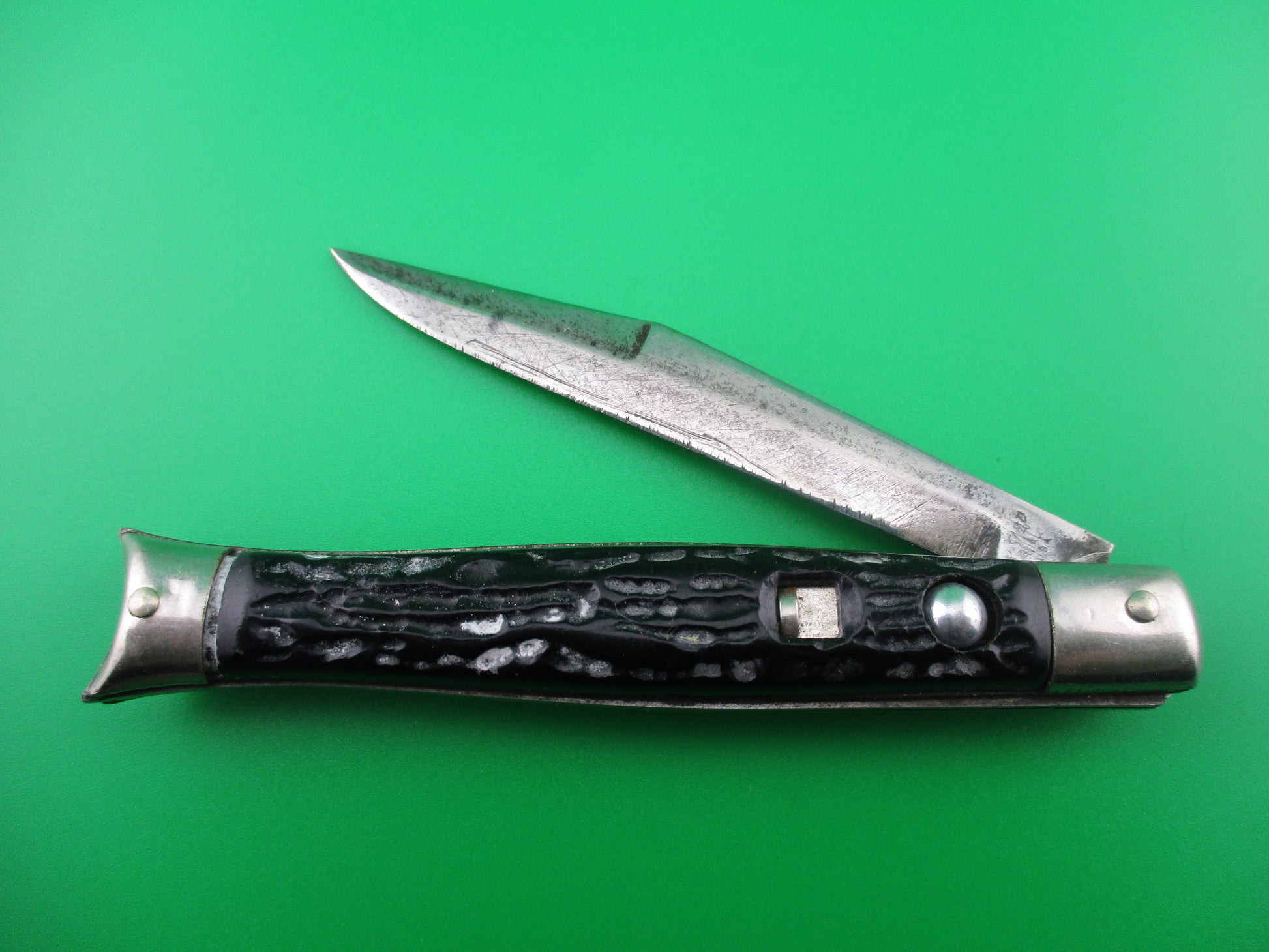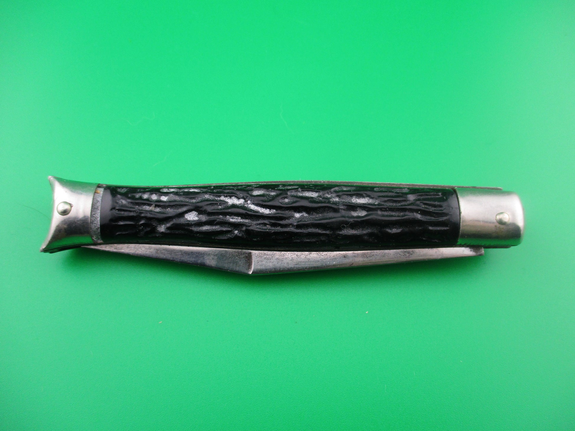 This is a Shur Snap fishtail switchblade with black synthetic scales which were often referred to as imitation stag model 1800B. The knife was made by the Colonial Knife Co of Providence, RI in the late 1950s, likely 1956-58. It measures 4 inches closed and 7.25 inches open and has steel liners. The tang is stamped SHUR SNAP over Colonial over PROV USA. We can tell it's a later 4th gen knife by the large domed button. The blade is mostly full and has a lot of scratches and a bit of light pitting, but good blade overall. The black synthetic (imitation stag) scales are in VG condition with minimal shrinkage. Operates well with blade tip below liner, good snap and good lockup. Safety works. 100% money back guarantee including return shipping if you're not happy with this knife.