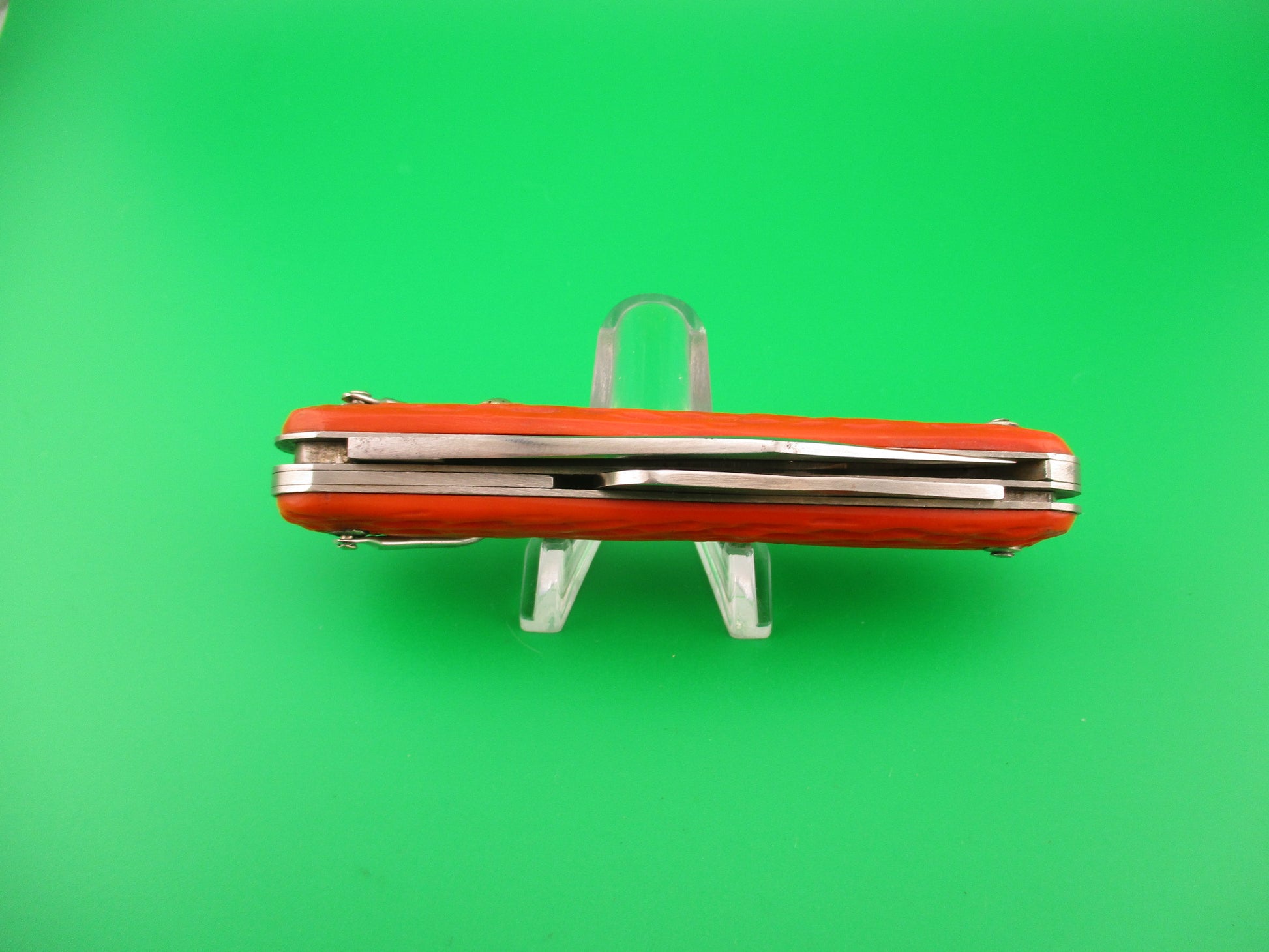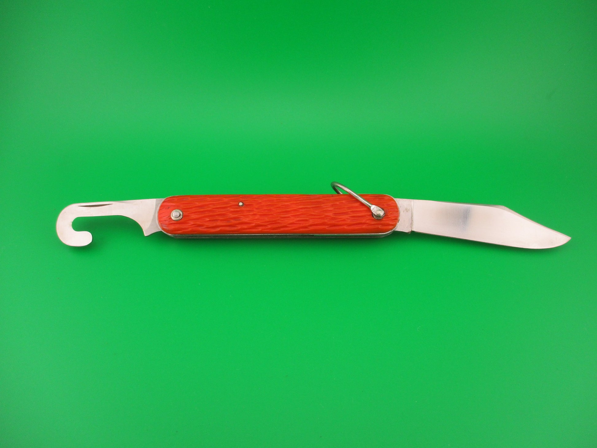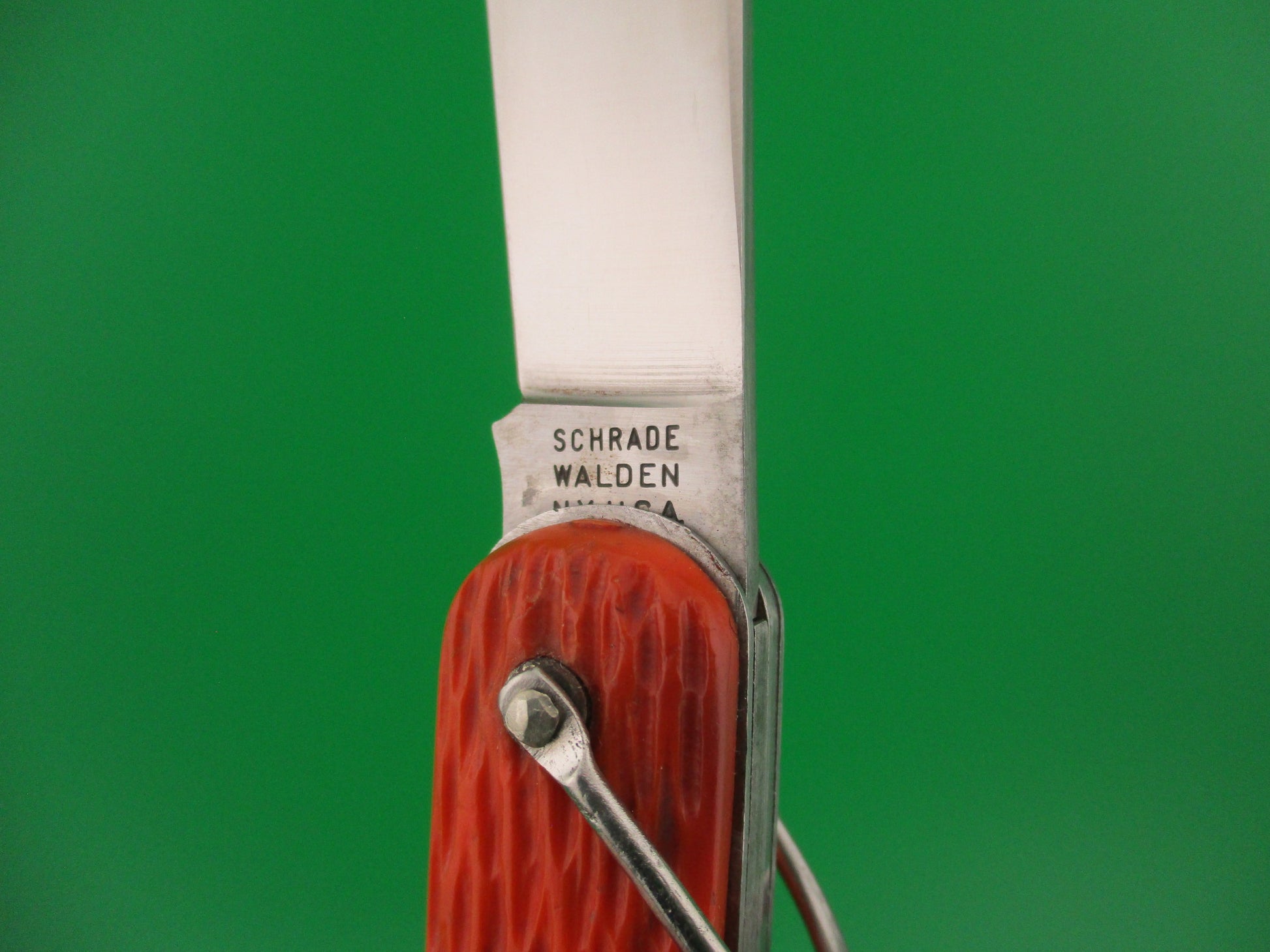 Schrade Walden vintage MC1 Orange military paratrooper switchblade knife. This knife was made for the US government under contract by Schrade Walden into the 1960s. These knives were issued to soldiers and various government agencies including NASA and were carried into space by astronauts. The knife measures 4.25 inches closed and 7 3/8 inches with clip blade open and it has steel liners. The clip blade is opened automatically by pressing the button and the hook blade opens manually. Typically paratroopers deployed with the hook blade in the open position for quick emergency use. The clip blade is marked Schrade Walden NY USA and is full and shiny with some scratches. The hook blade is like new condition and works perfectly. The orange jigged scales are in very good condition with a little shrinkage and this is the earlier 3 pin version. The knife works great with the clip blade tip even with the liners when closed, good snap and good lockup when open with about 1/8: up and down at the tip. Rattles if shaken with blade open as most of these do after seeing use. Safety works. EX condition.