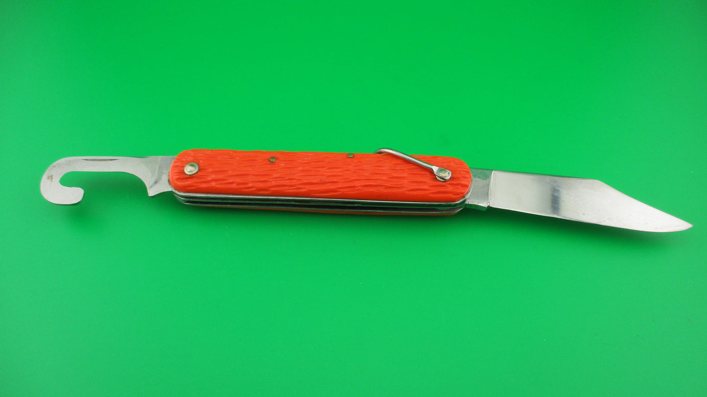 Schrade Walden vintage MC1 Orange military paratrooper switchblade knife. This knife was made for the US government under contract by Schrade Walden into the 1960s. These knives also saw use by NASA and carried into space with astronauts as well as other government agencies. The knife measures 4.25 inches closed and 7 3/8 inches with blade open and it has steel liners & lanyard ring with nickel silver button & safety. The clip blade is opened automatically by pressing the button and the hook blade opens manually. Typically paratroopers deployed with the hook blade in the open position for quick emergency use. The clip blade is marked Schrade Walden NY USA STAINLESS and is 99% full with original factory finish and some scratches. The hook blade is basically unused. The orange jigged scales are in excellent condition with minimal shrinkage. The knife works great with the blade tip below the liners closed, good snap and fair lockup open with about 1/8" movement at the tip both ways. Rattles if shaken with the blade open as most do that have seen use over the years. Safety works. EX- condition.