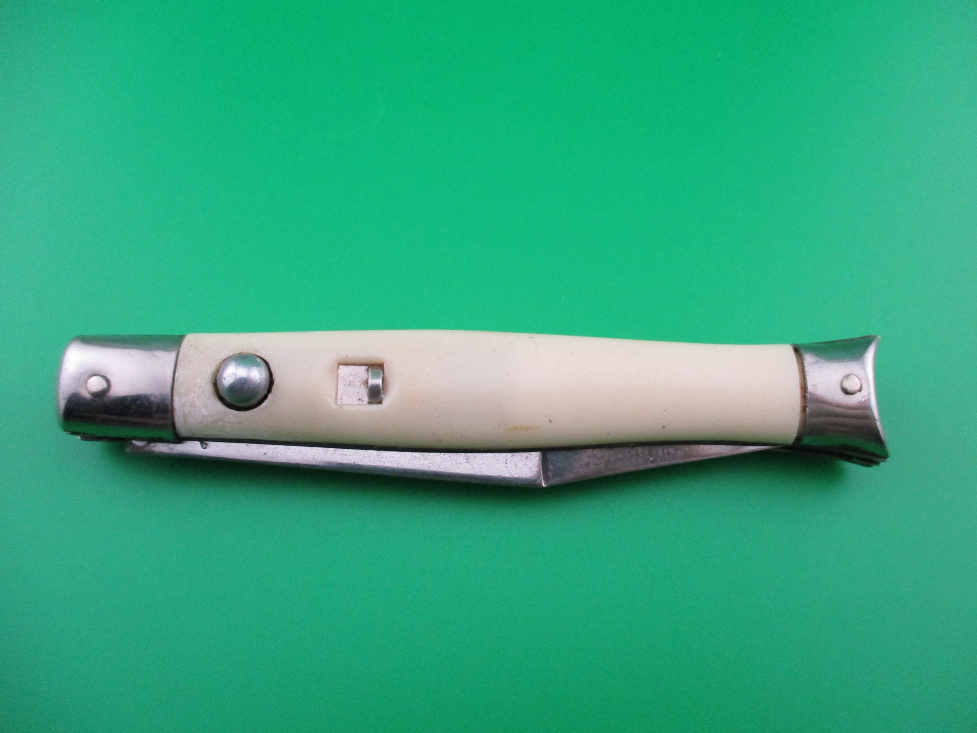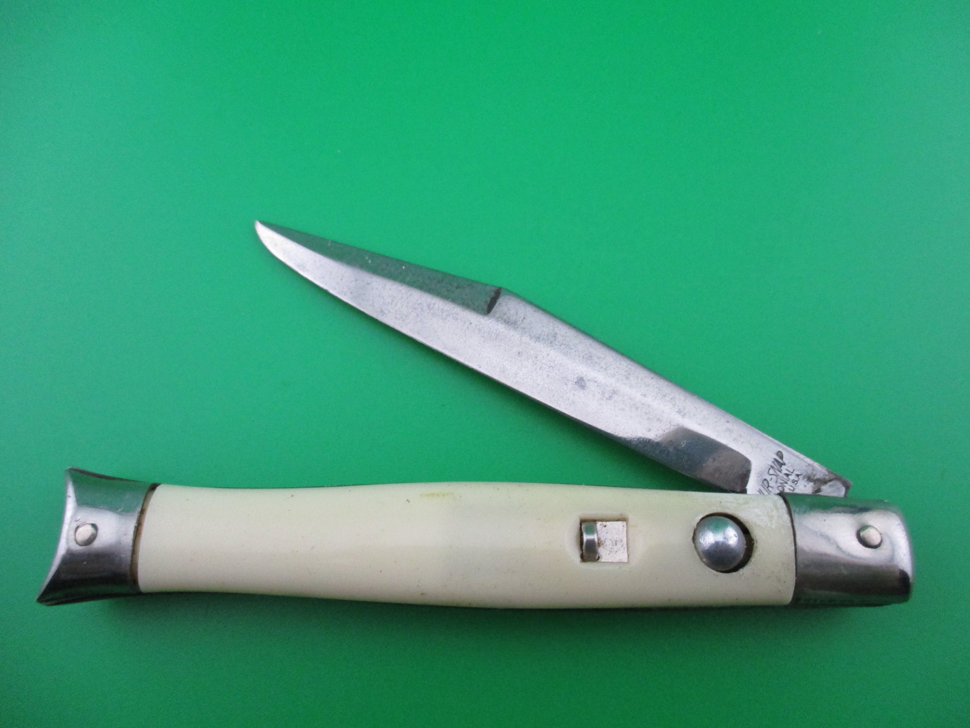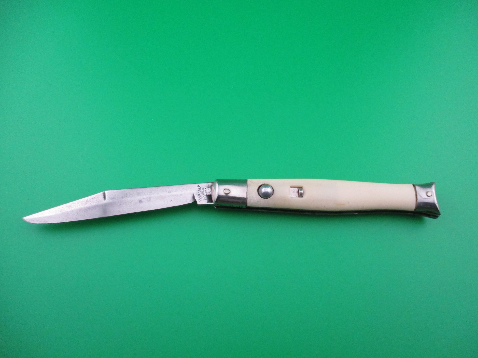 This is a Shur Snap switchblade with cream synthetic scales. The knife was made by the Colonial Knife Co of Providence, RI in the late 1950s, likely 1956-58. It measures 4 inches closed and 7.25 inches open and has steel liners. The tang is stamped SHUR SNAP over Colonial over PROV USA. We can tell it's a later 4th gen knife by the large domed button. The blade full and shiny with most of the factory finish. Nice blade. The cream colored synthetic scales are in nice condition with minimal shrinkage. Operates well with blade tip below liner, good snap and TIGHT lockup. Safety works. 100% money back guarantee including return shipping if you're not happy with this knife.