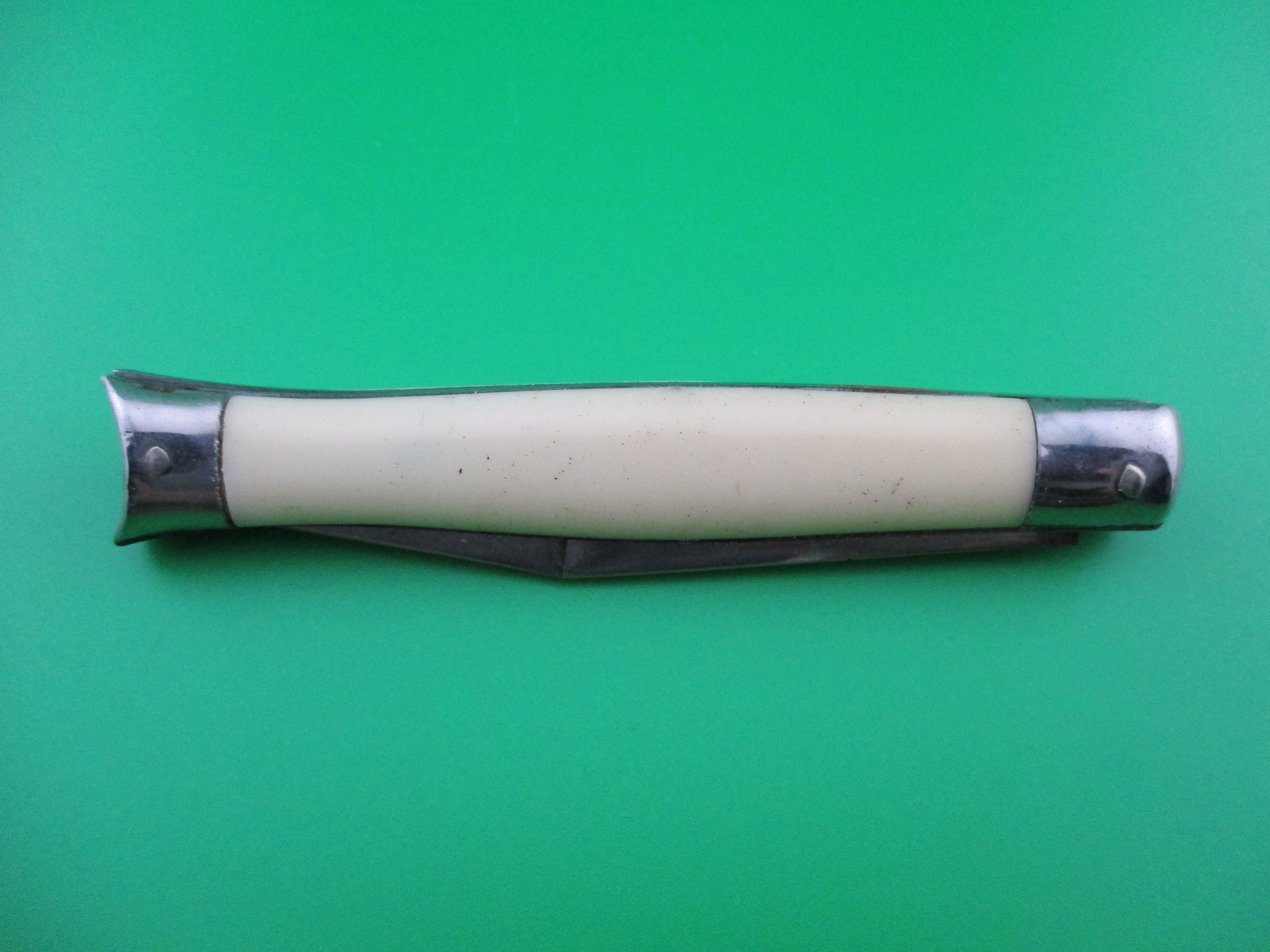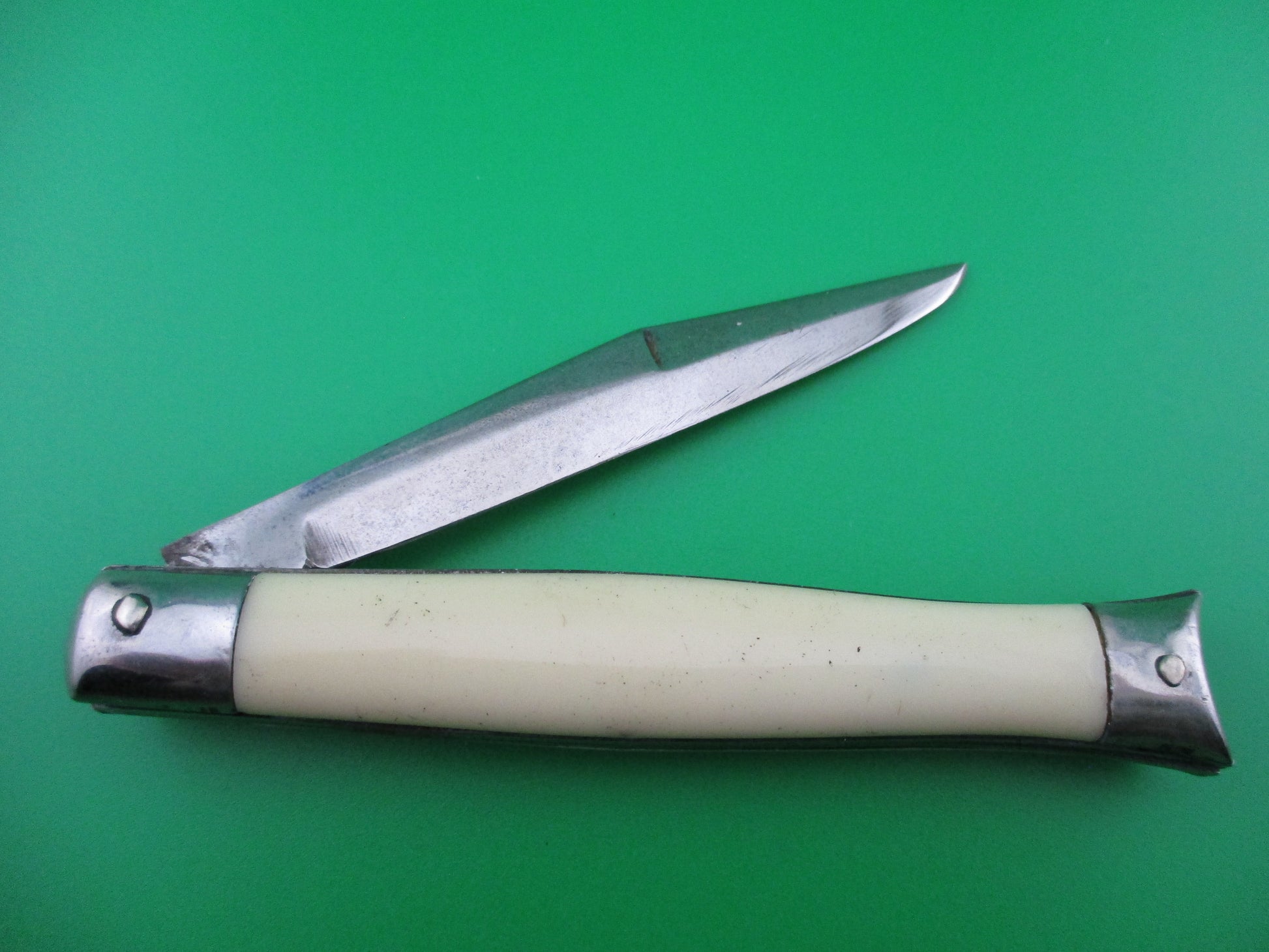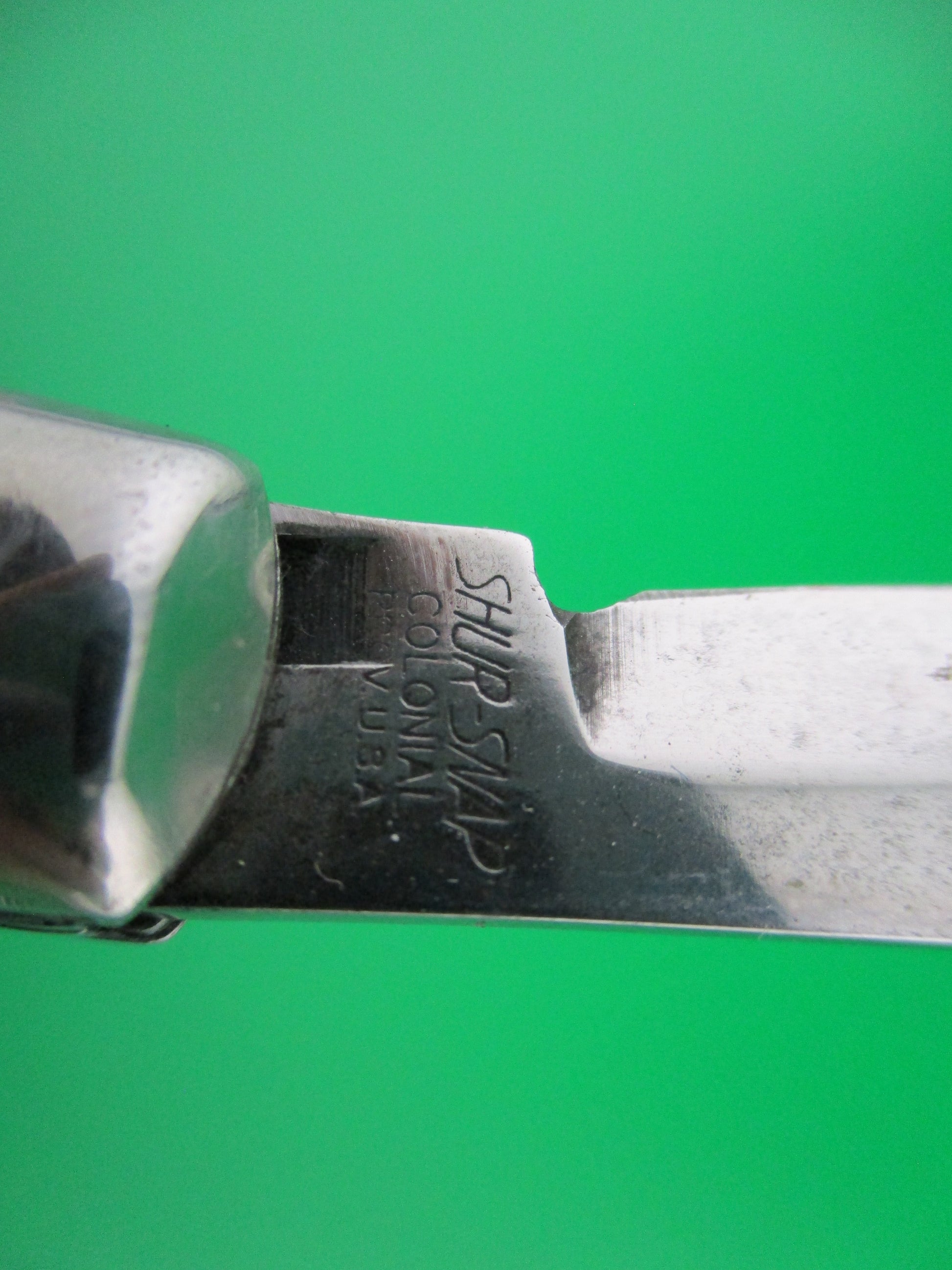 This is a Shur Snap switchblade with cream synthetic scales. The knife was made by the Colonial Knife Co of Providence, RI in the late 1950s, likely 1956-58. It measures 4 inches closed and 7.25 inches open and has steel liners. The tang is stamped SHUR SNAP over Colonial over PROV USA. We can tell it's a later 4th gen knife by the large domed button. The blade full and shiny with most of the factory finish. Nice blade. The cream colored synthetic scales are in nice condition with minimal shrinkage. Operates well with blade tip below liner, good snap and TIGHT lockup. Safety works. 100% money back guarantee including return shipping if you're not happy with this knife.