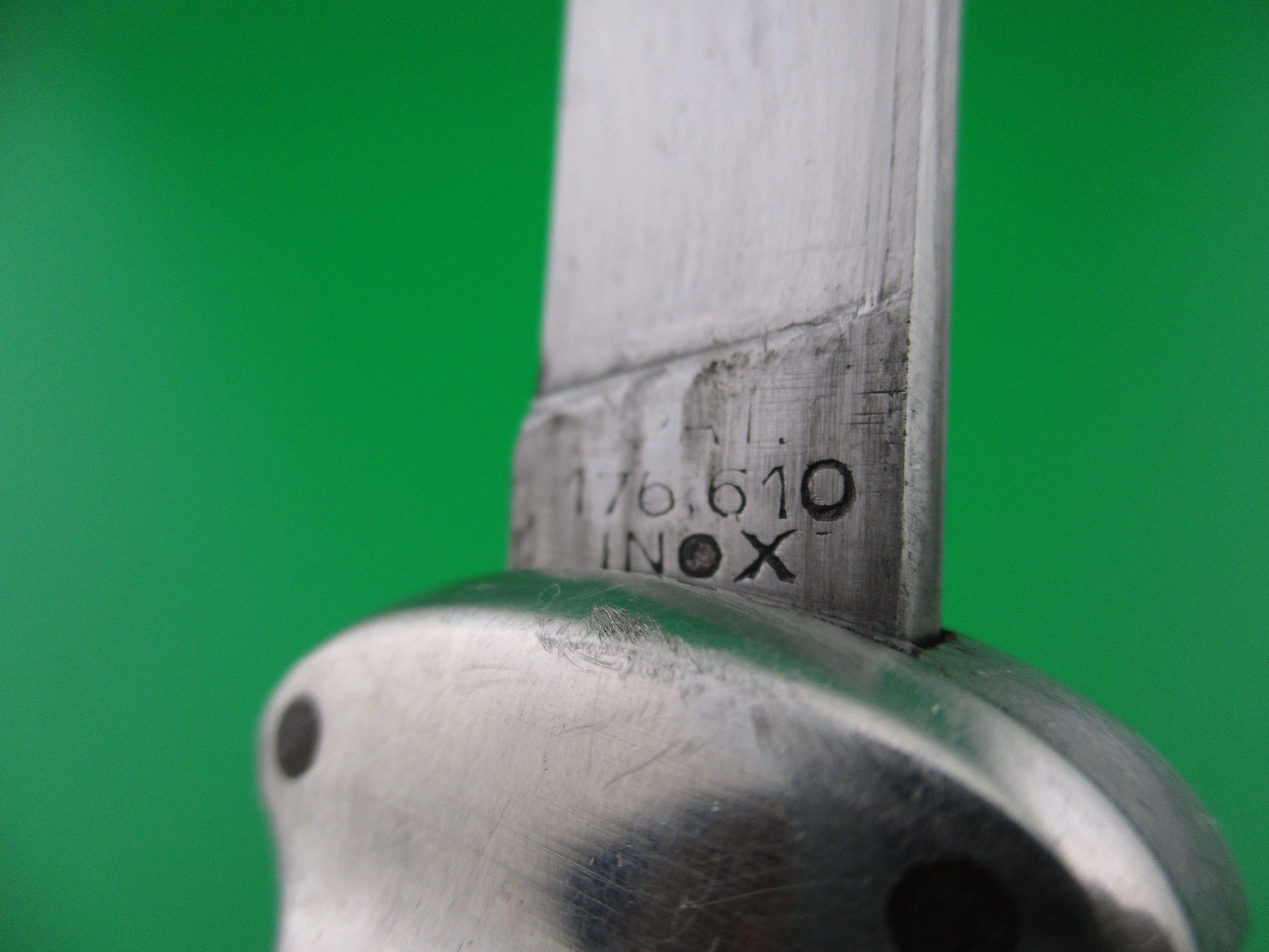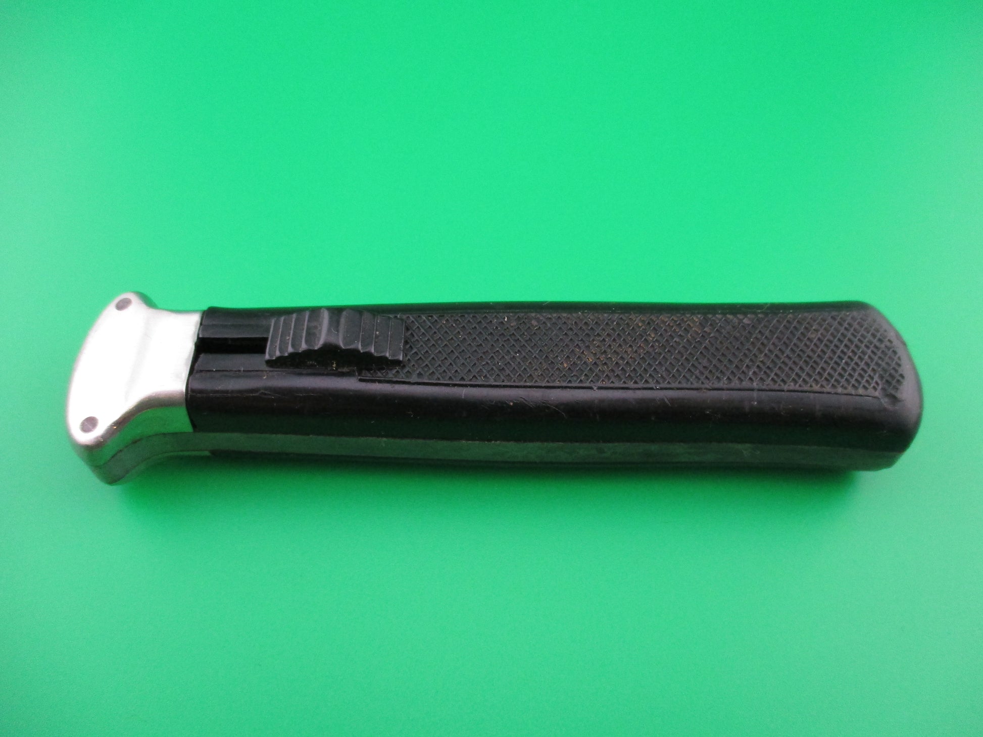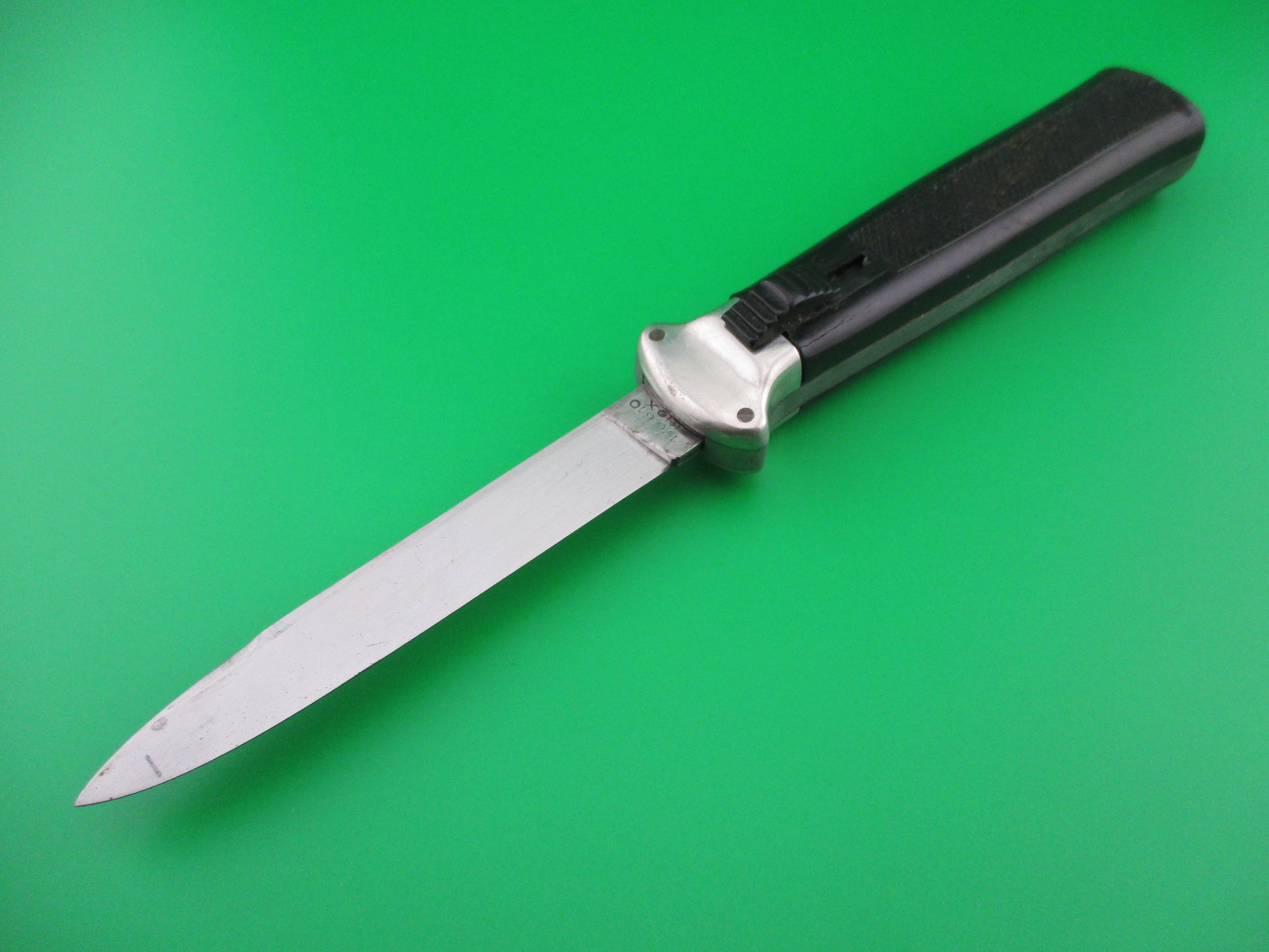 Spanish OTF INOX Out-the-Front double action automatic knife. Measures 21cm (8.25 inches) open with Aluminum frame and bolsters. The flat grind swedge blade is marked PAT 176610 INOX and is full with patina and light scratches. The black checkered synthetic scales are in very nice condition and show some light handling marks. The knife works perfectly. Push forward on the release knob and the blade flies open and locks. Pull back on the knob and the blade closes. Very nice vintage Spanish OTF.
