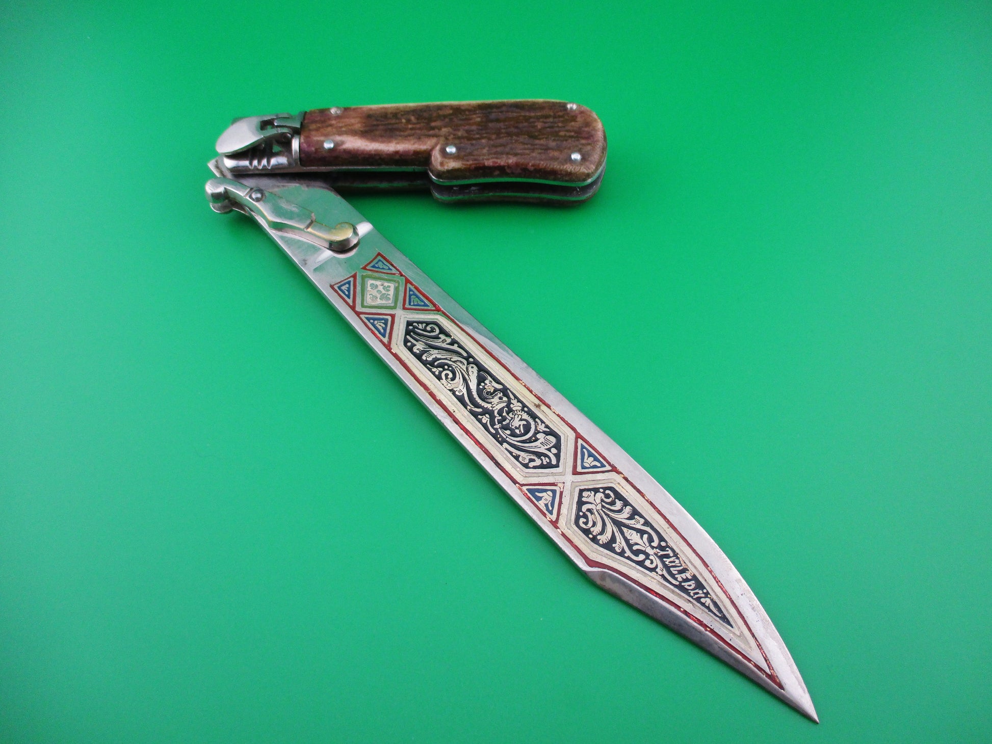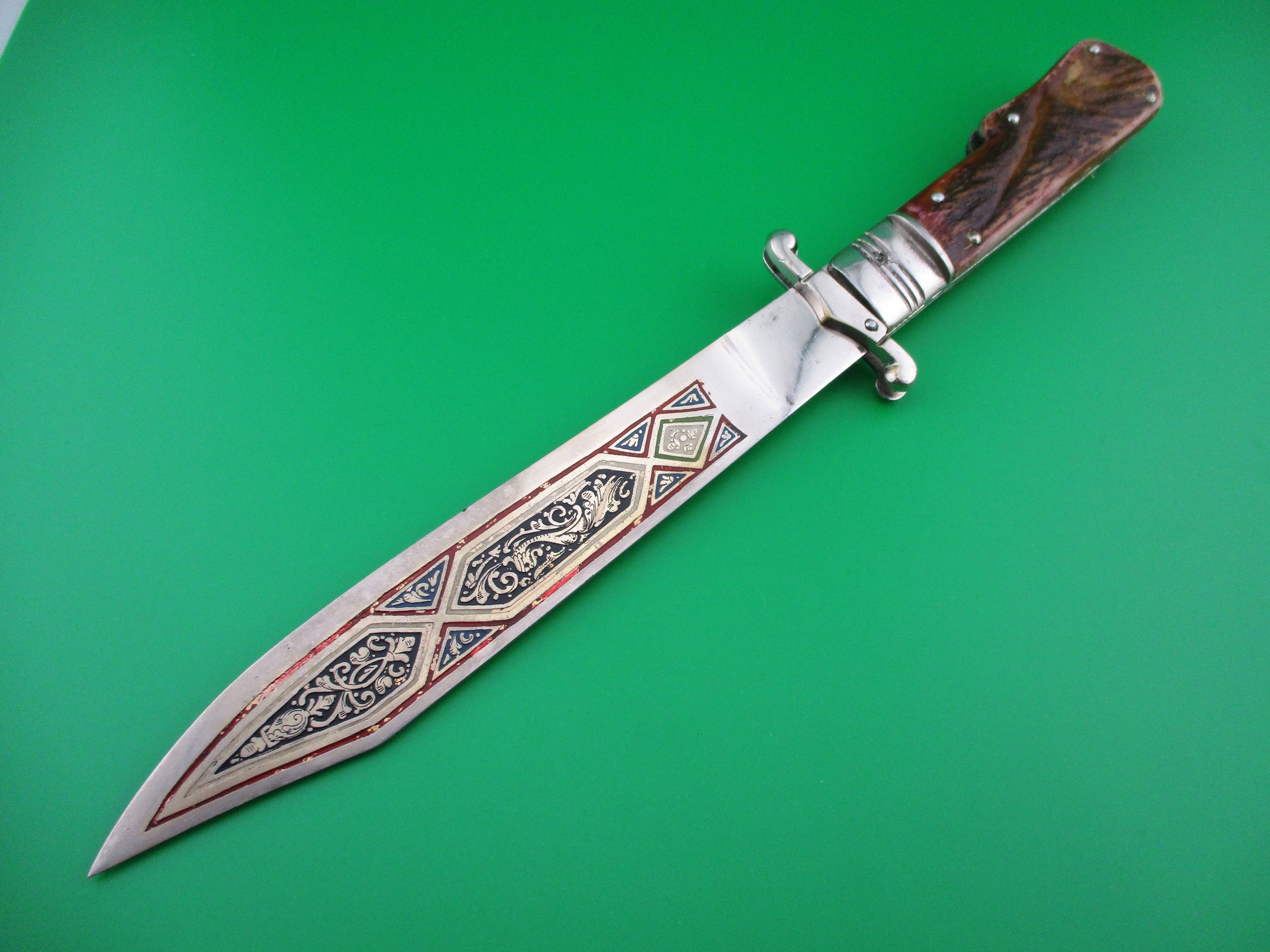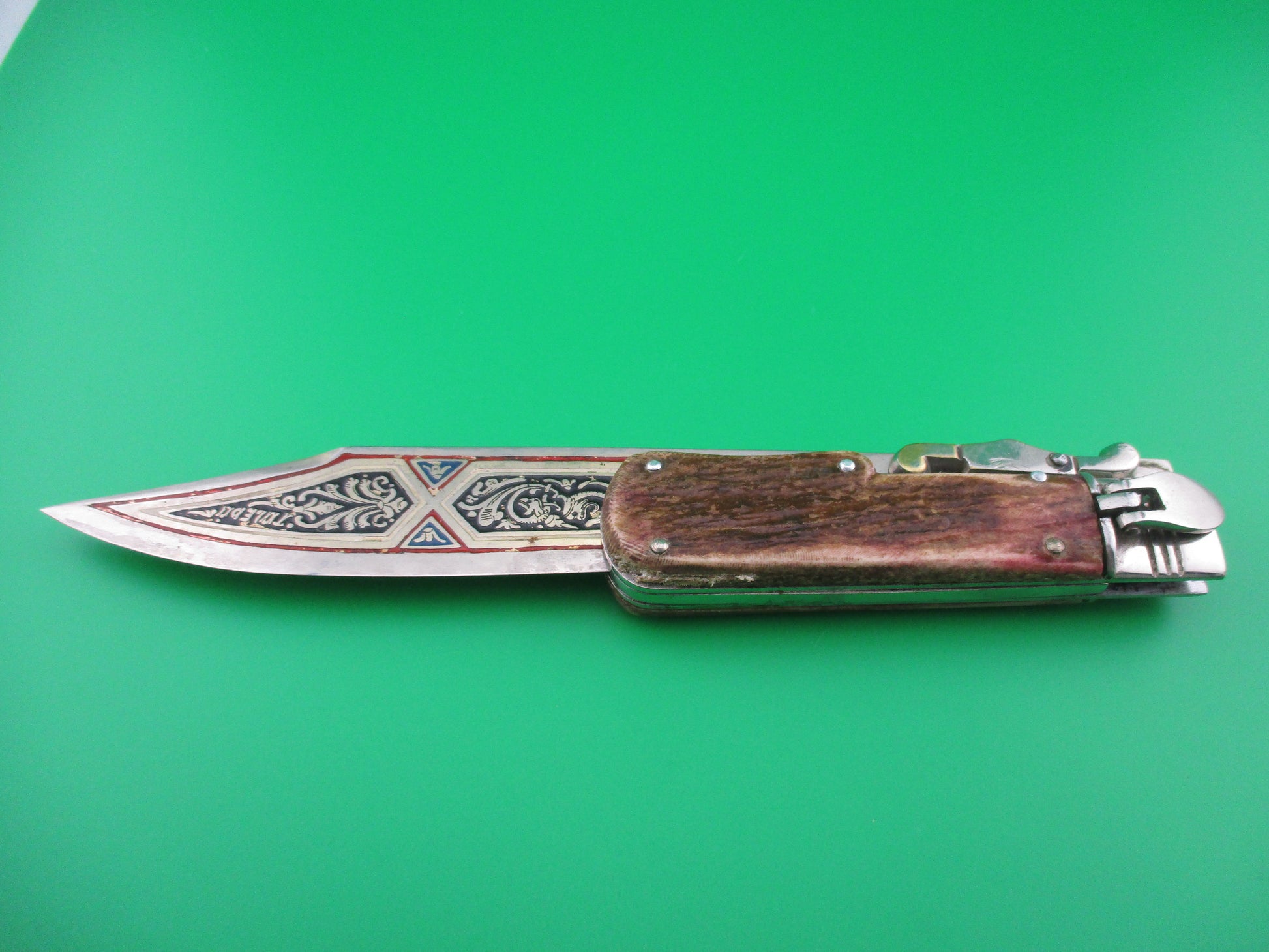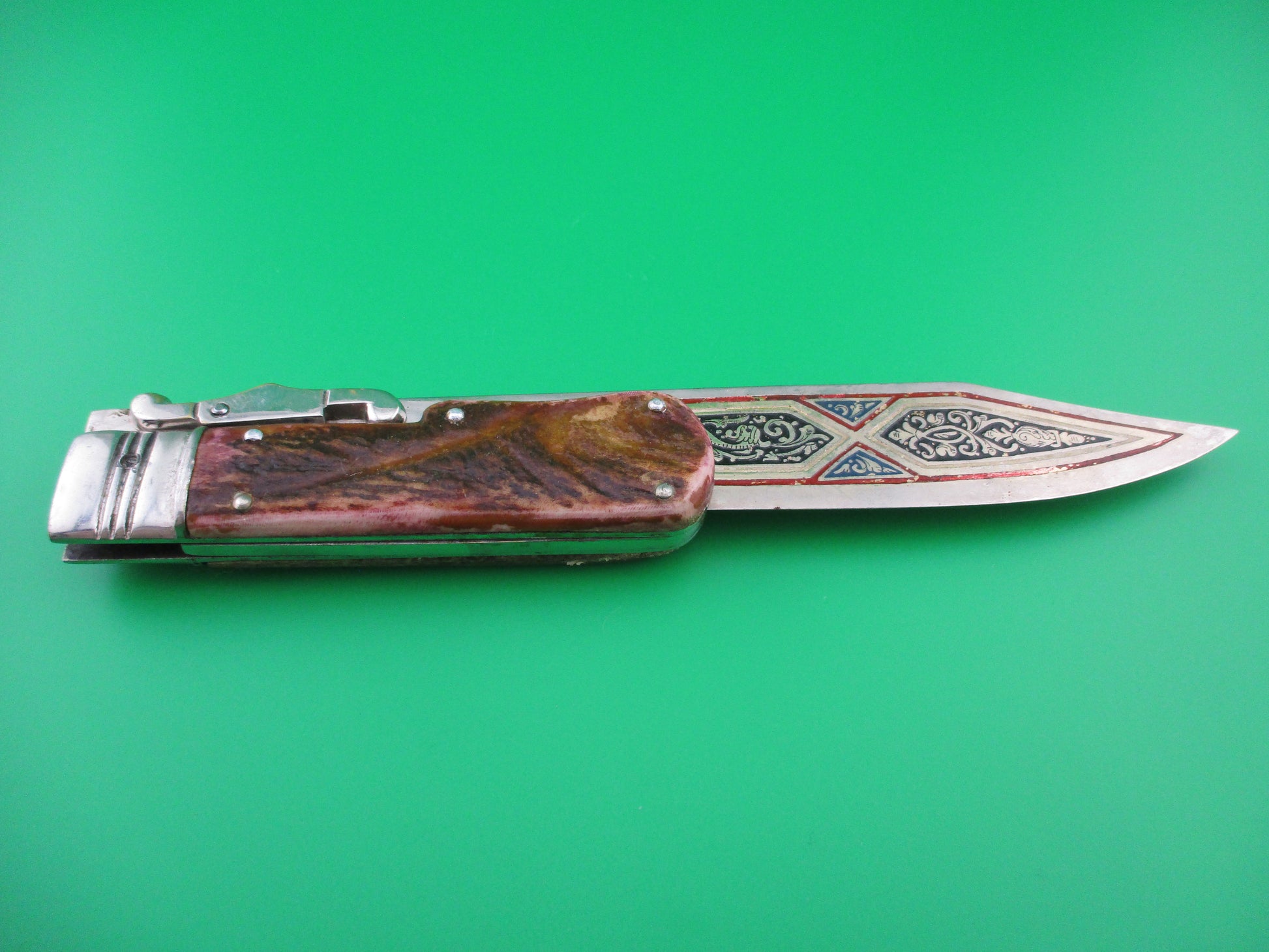 This is a manual folding knife with an extra long blade made in Spain. It measures 11 inches open with steel liners, bolsters & lever, but nickel silver folding guards. The blade is elaborately decorated and engraved on both sides with 5 different colors of painted lines and the word TOLEDO in the design on the front of the blade. These were most likely expensive souvenirs for tourists visiting Toledo, Spain in the 1960s or 70s. It likely originally had a leather sheath that it rested in. The scales (handles) are stag with some reddish tint and are in good condition. The knife works well and the lever is used to release the blade to be closed from the locked open position. Not used to open the knife. Neat old Spanish tourist souvenir knife.