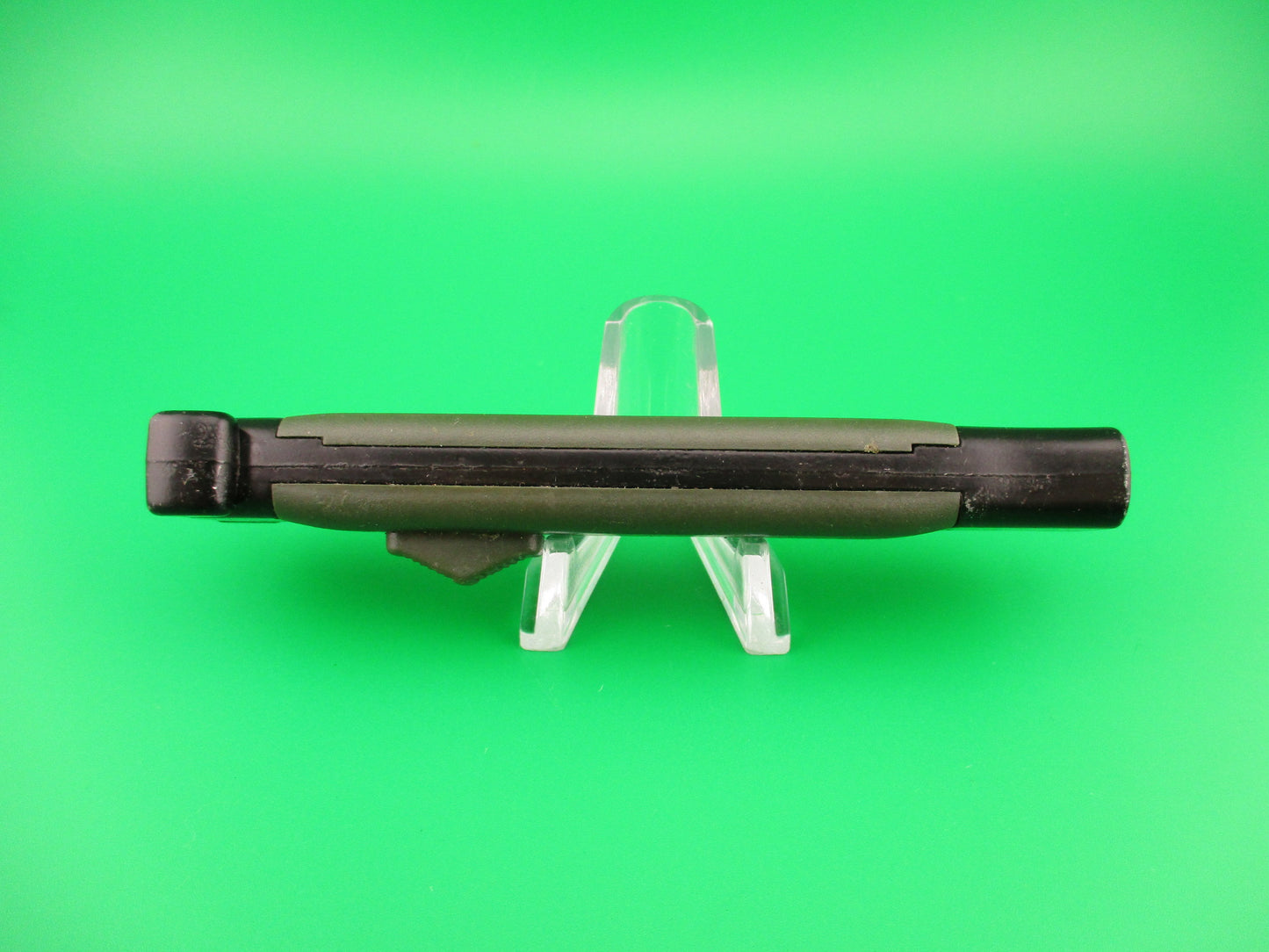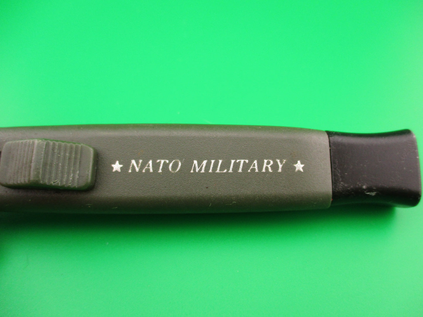 Vintage STAINLESS ROSTFREI NATO MILITARY Double Action OTF 20cm green automatic knife with black bolsters likely made in Korea or Taiwan in the 1980s or 90s. It measures 20cm (7 13/16 inches) open with non magnetic frame with ear muff black bolsters. The flat spear point blade is 100% full with factory finish & sharpened factory edge and is stamped STAINLESS ROSTFREI on the tang. Green synthetic scales are in great condition with no cracks or shrinkage w less common black coated bolsters. Works great with blade opening fully and locking when knob is pushed forward and retracts into the frame when knob is pulled back. EX+ condition.