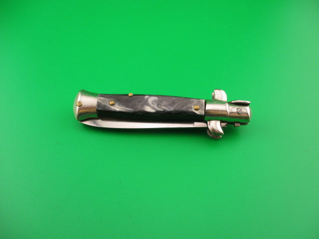 Sterile 16cm Italian Stiletto swivel bolster flat top plastic scales automatic knife made in Italy sometime after 1990. The knife measures 16cm (6.25 inches) open and 3.5 inches closed with steel liners, bolsters, button & safety cap. Rear finger guards are steel lined. The flat grind blade is 98% full or better with no stamp (markings) and has been sharpened. The scales are synthetic (plastic) with front being black and back scale black & white swirl with a couple of minor dings and flat tops (surfaces). The knife works great with blade tip just below liners closed, strong snap and tight lockup with a hint of side to side. No rattle if shaken with blade open. Safety does NOT work.