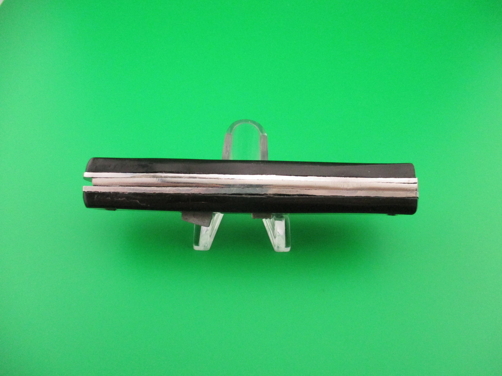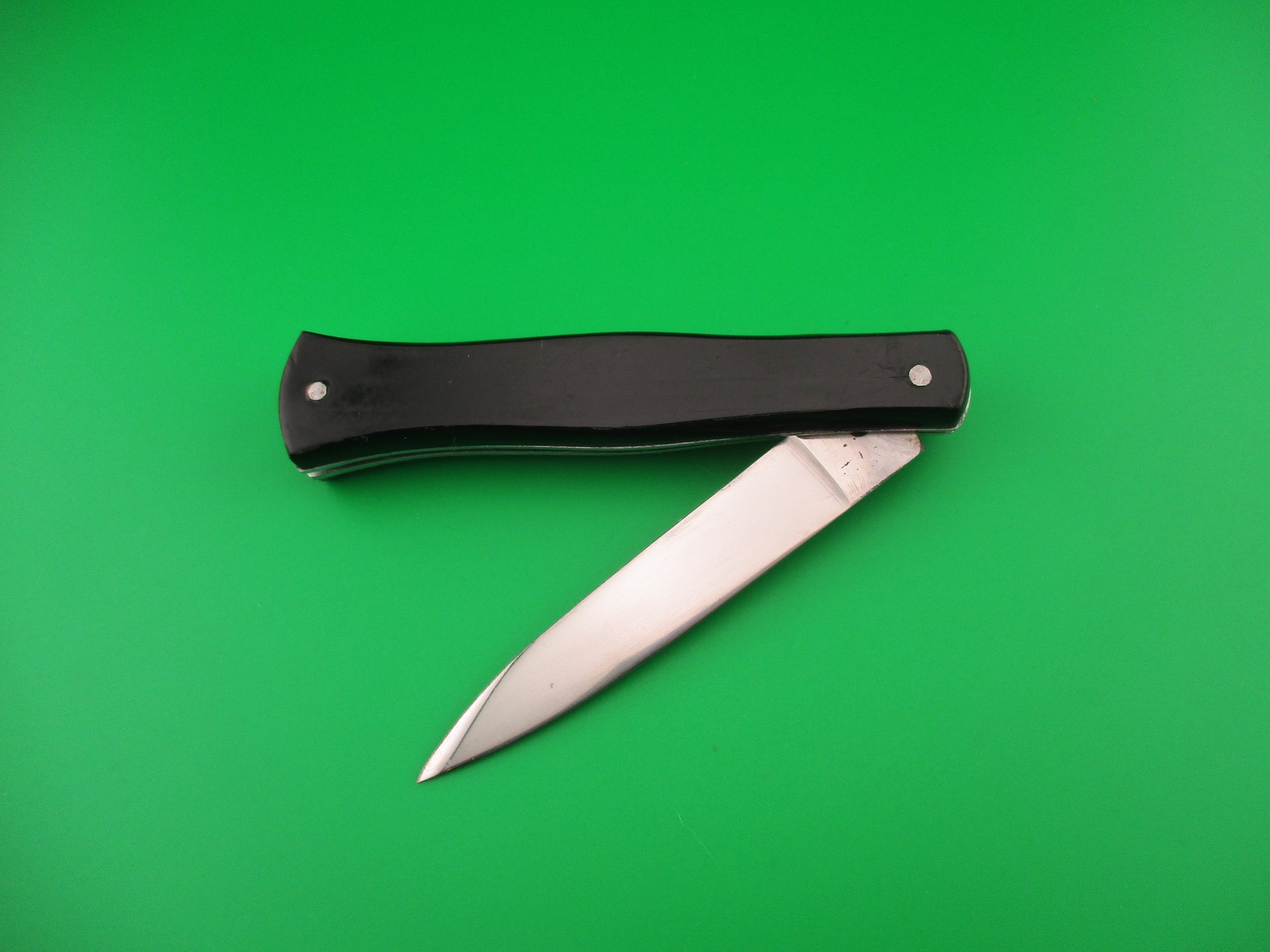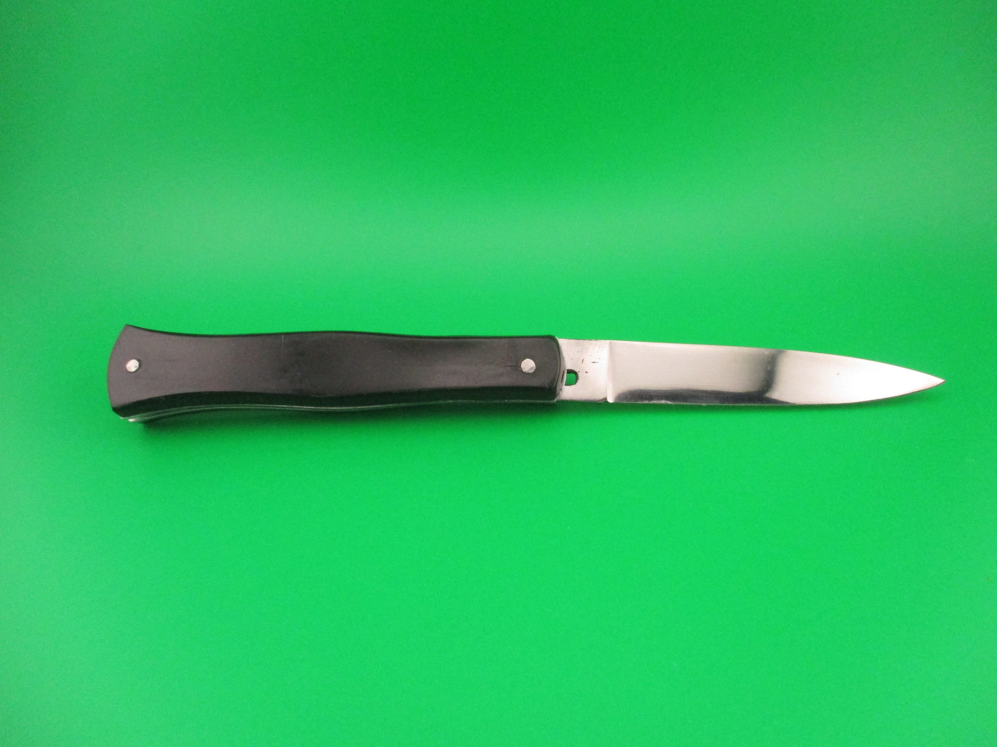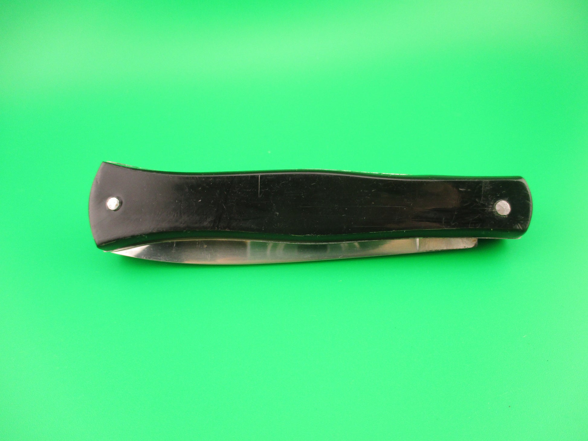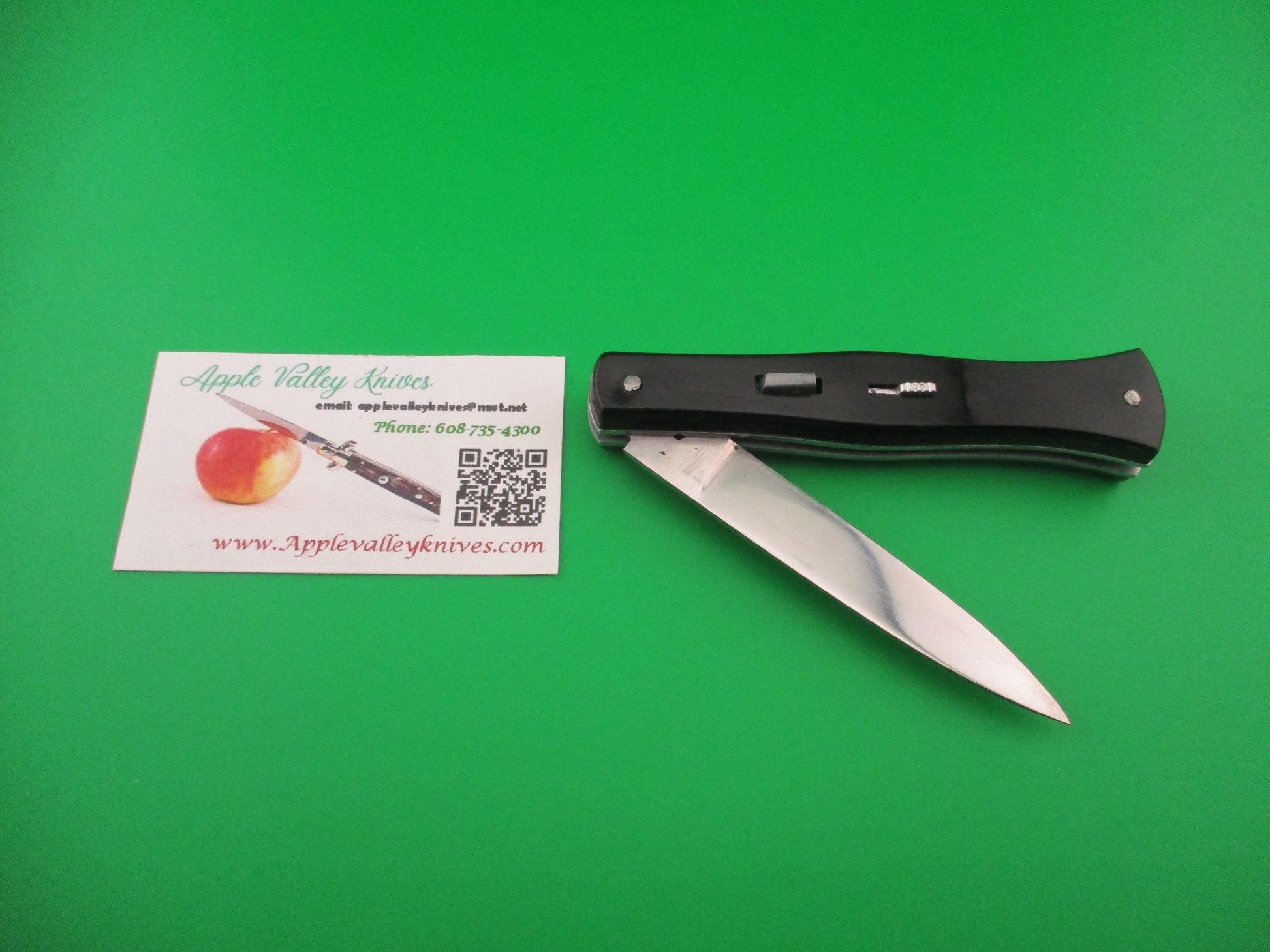 Sterile 21cm Spanish Fishtail Black Rectangular button vintage automatic knife made in Spain 1960s or 70s. The knife measures 20.6cm (8 1/16 inches) open and 4 7/16 inches closed with aluminum liners, button & safety. The flat spear point blade is 99% full or better with original finish with light scratches & scuffs and no markings on the blade. The black synthetic (plastic) handles (scales) are in good condition with lots of light scuffs/handling marks. The knife works well with blade tip below liners closed, strong snap and good lockup with about 1/8" up and down at the tip. Rattles if shaken with blade open. Safety works. VG+ condition.