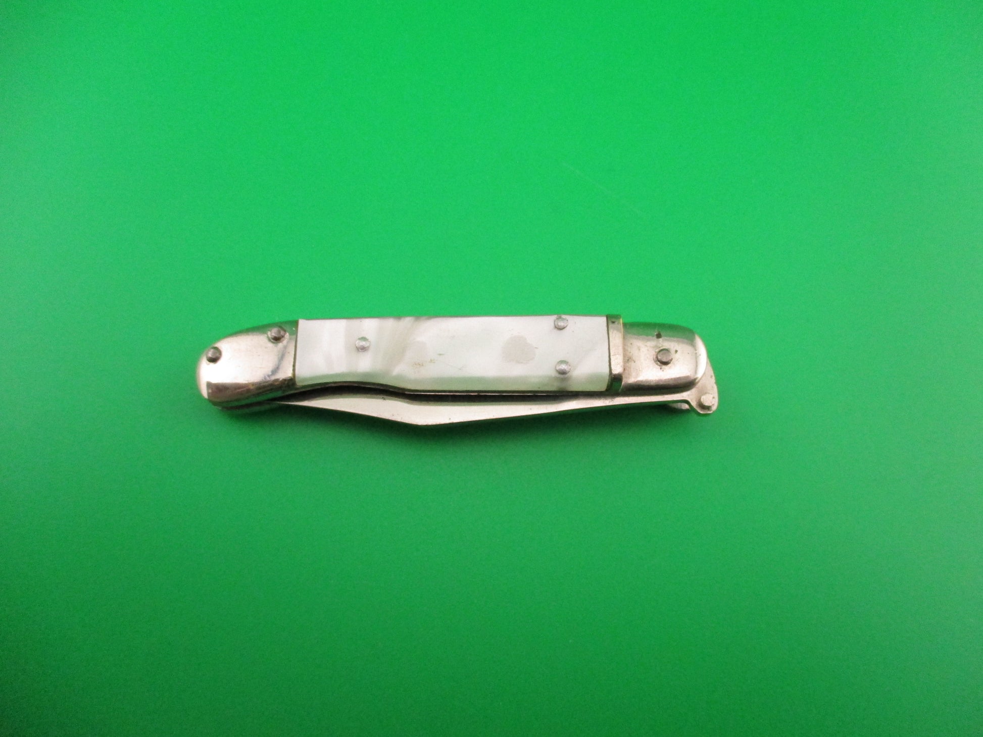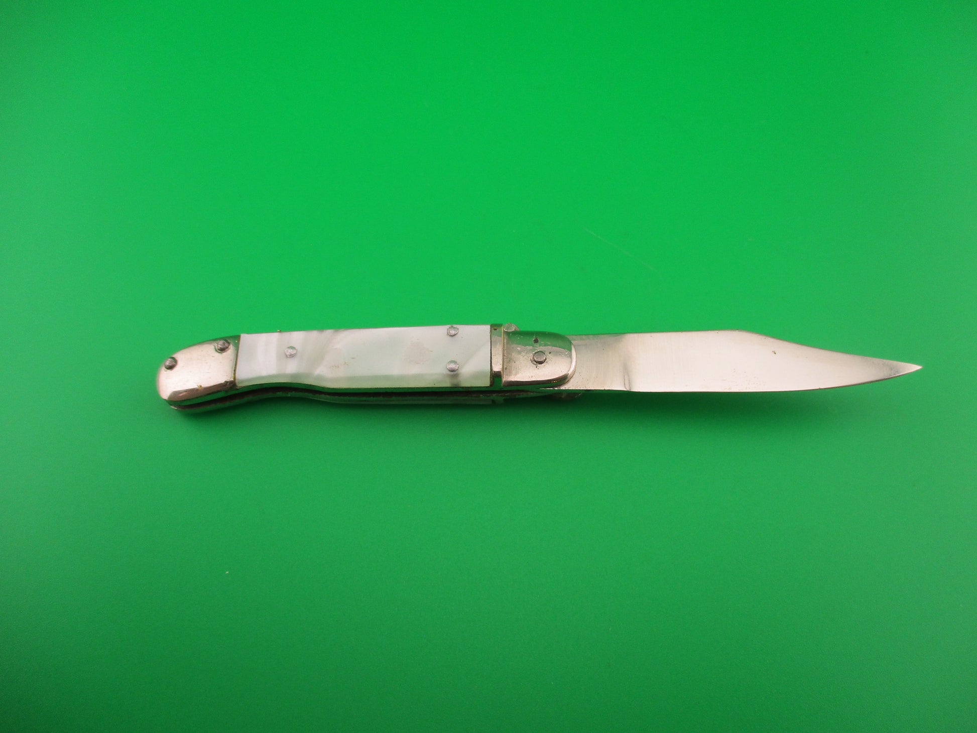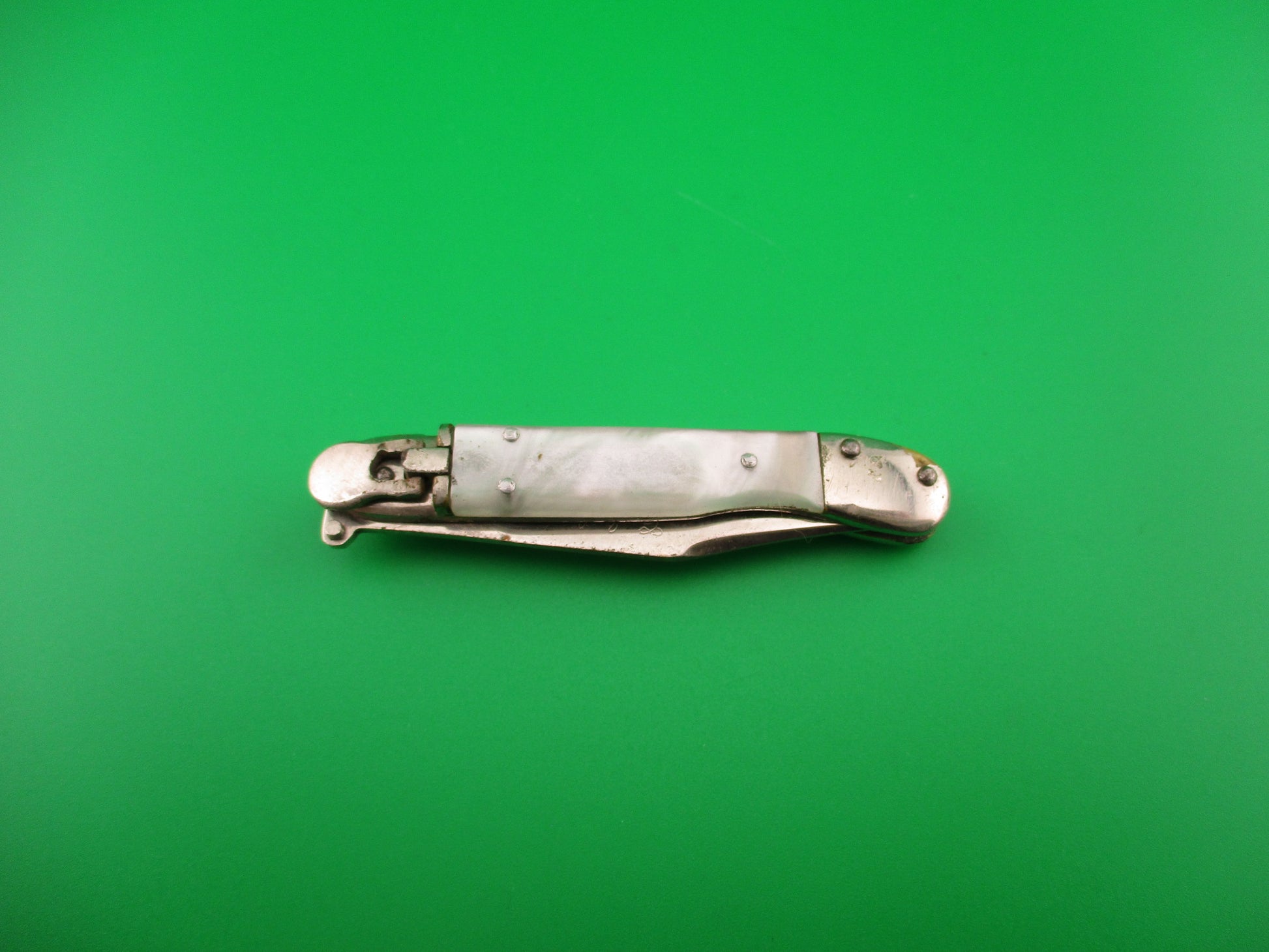 Vintage Toledo 12cm Spanish Lever Pearlex Tourist Souvenir automatic knife made in Spain in the 1960s or 70s. This rare little knife measures 11.8cm (4.6 inches) open and 2 5/8" closed with chrome plated brass liners & bolsters and steel lever. The clip swedge blade is 100% full with original finish with light stains and is engraved Toledo. The pearlex scales are very attractive and in nice condition. The knife works well with blade tip deep & centered closed, good snap and TIGHT lockup! Extremely hard to find in this size. EX condition.