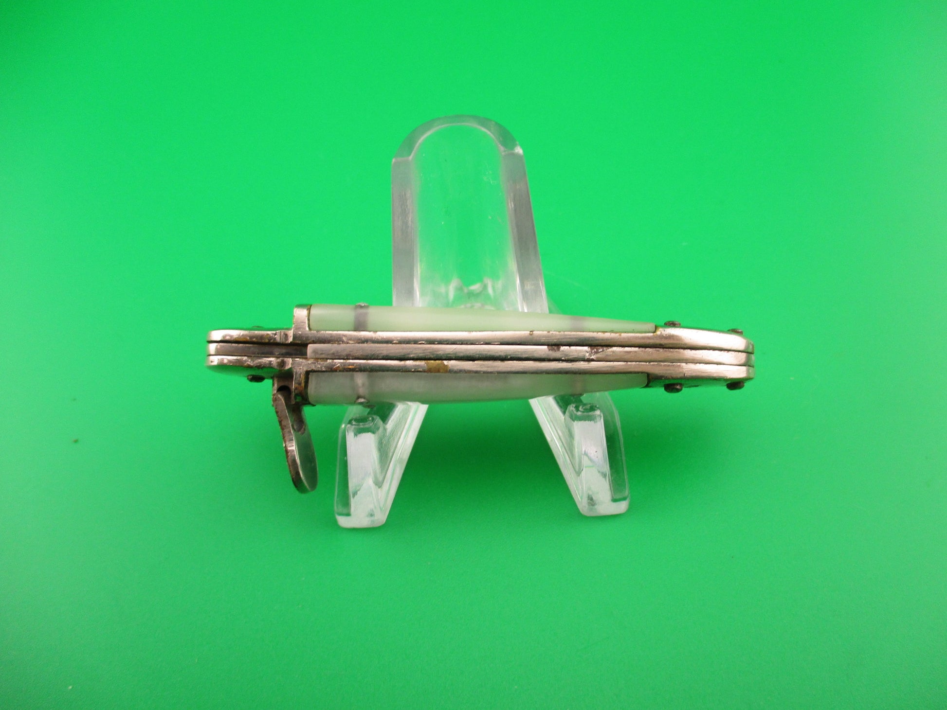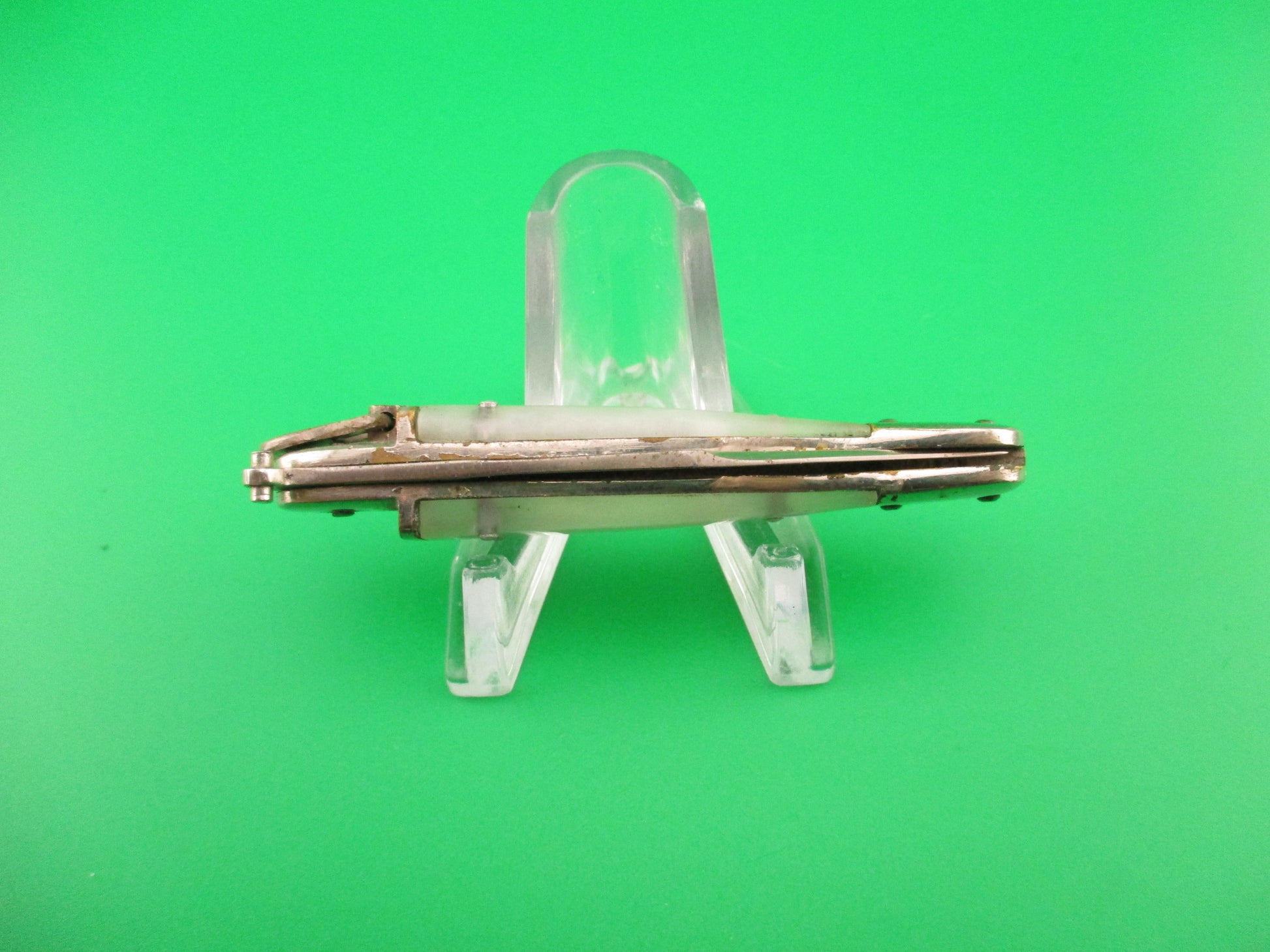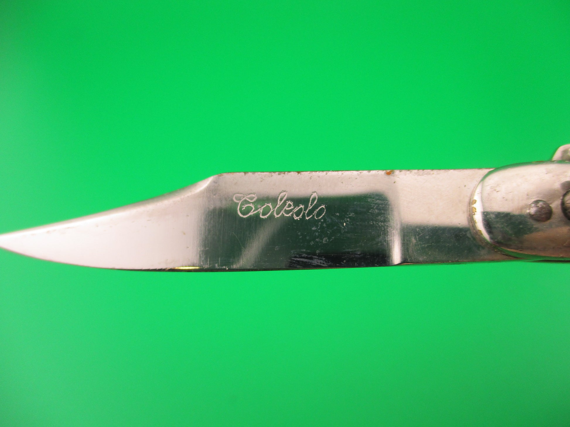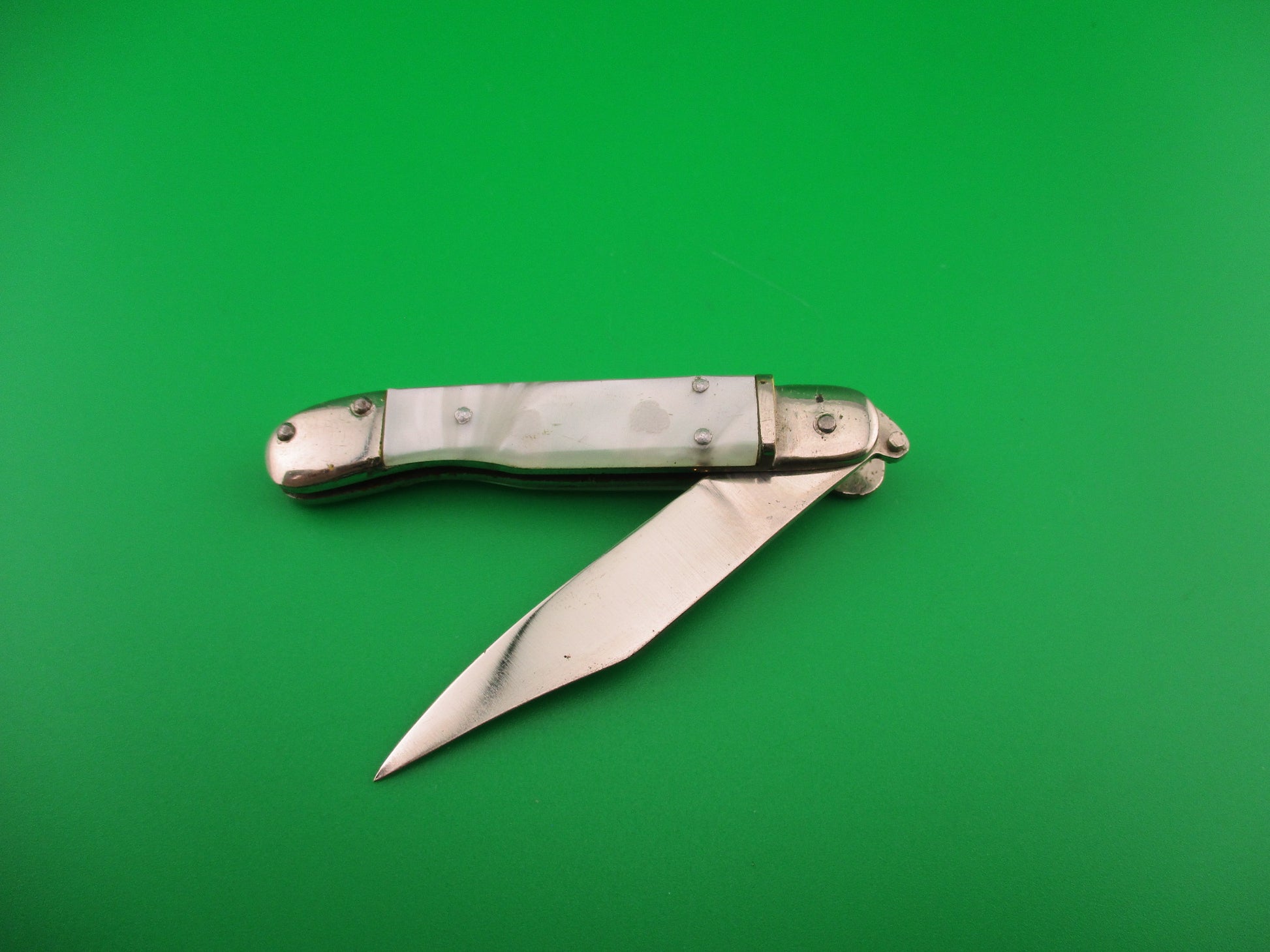 Vintage Toledo 12cm Spanish Lever Pearlex Tourist Souvenir automatic knife made in Spain in the 1960s or 70s. This rare little knife measures 11.8cm (4.6 inches) open and 2 5/8" closed with chrome plated brass liners & bolsters and steel lever. The clip swedge blade is 100% full with original finish with light stains and is engraved Toledo. The pearlex scales are very attractive and in nice condition. The knife works well with blade tip deep & centered closed, good snap and TIGHT lockup! Extremely hard to find in this size. EX condition.