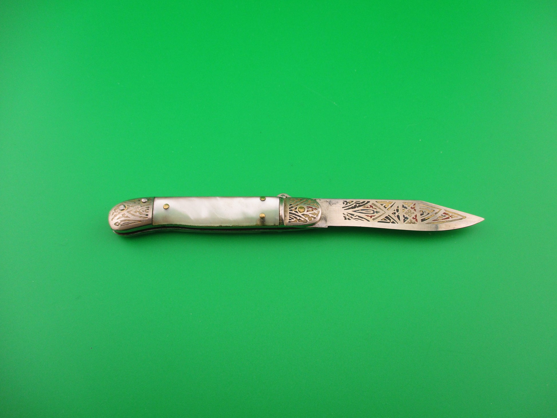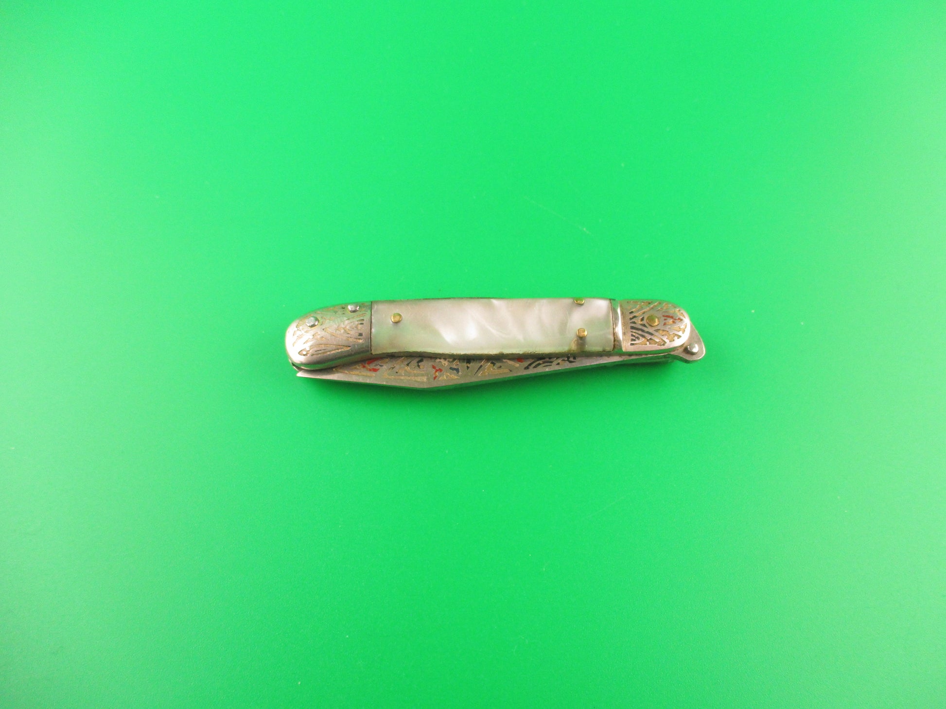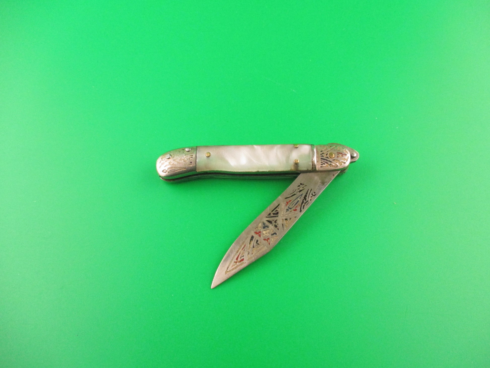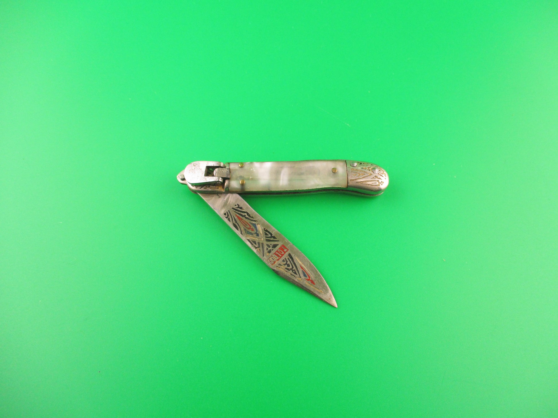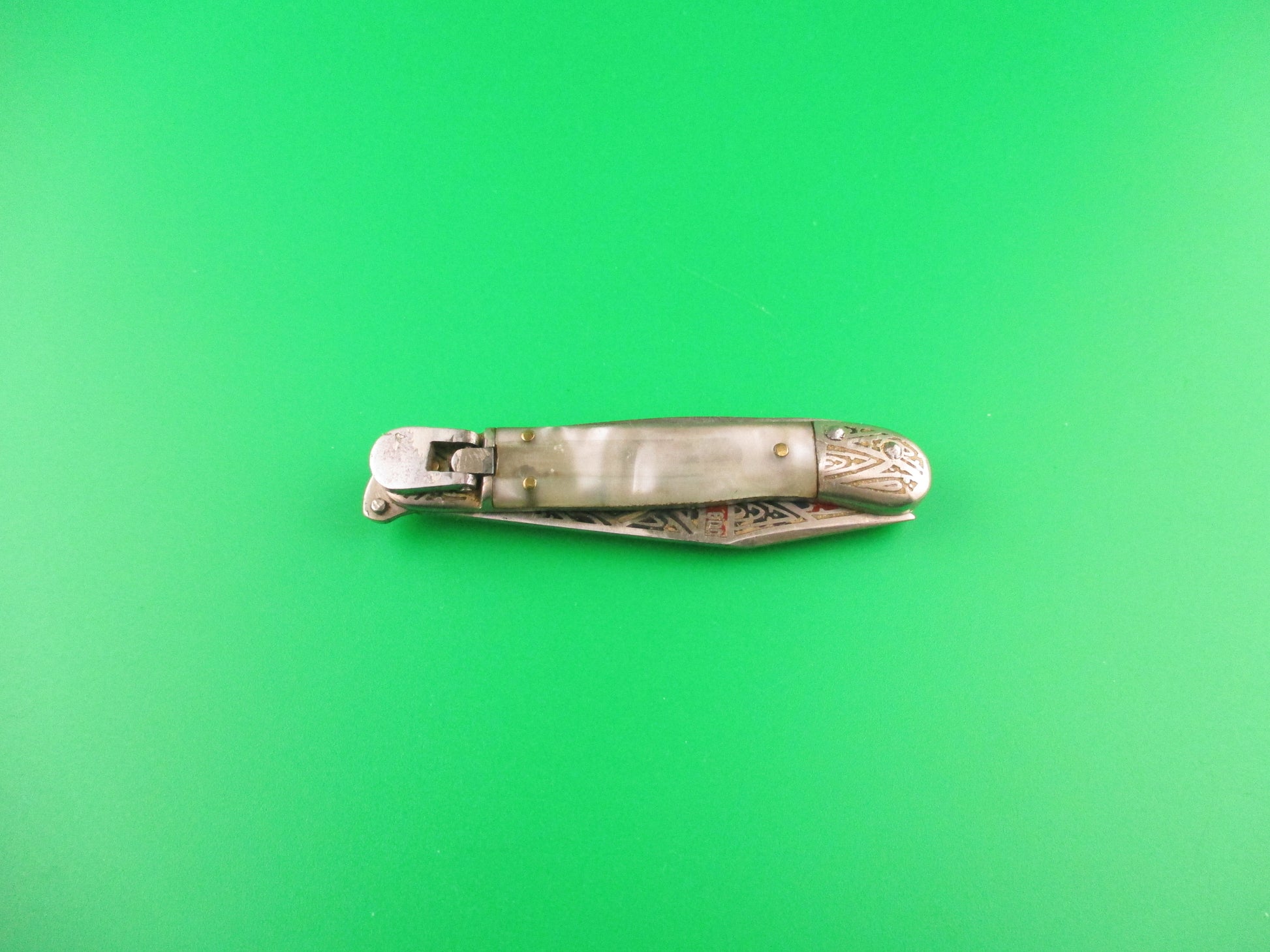 Vintage Toledo 12cm Spanish Lever Pearlex Tourist Souvenir automatic knife made in Spain in the 1960s or 70s. This rare little knife measures 11.6cm (4 9/16 inches) open and 2 5/8" closed with chrome plated brass liners & bolsters and steel lever. The clip blade is 99% full with original finish with colored engraving with Red, white, green, black & gold with the word Toledo on the front. The pearlex scales are very attractive and in nice condition. The knife works well with blade tip slightly above liners closed, good snap and very good lockup with just a hint of movement at the tip. Extremely hard to find in this size. EX condition.