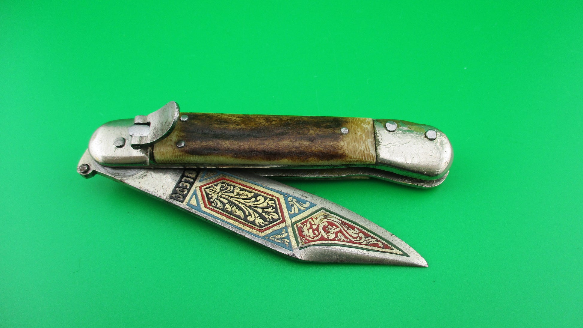 TOLEDO 17cm Spanish Vintage Stag Lever Tourist automatic knife with painted blade most likely made in the 1960s or 70s. Most of these knives were sold to tourists as souvenirs and are pretty decent quality dressed up knives. This one measures 17cm (6 11/16 inches) open with non magnetic liners and bolsters and steel lever. The clip blade is very decorated and painted and the only marking on the blade is TOLEDO. The stag scales are in good condition. The knife works good with the blade tip even with the liners, good snap and good lockup with about 1/8" up and down at the tip. The kick spring has been replaced. Not exactly like the original spring, but it does work well. G+ condition.
