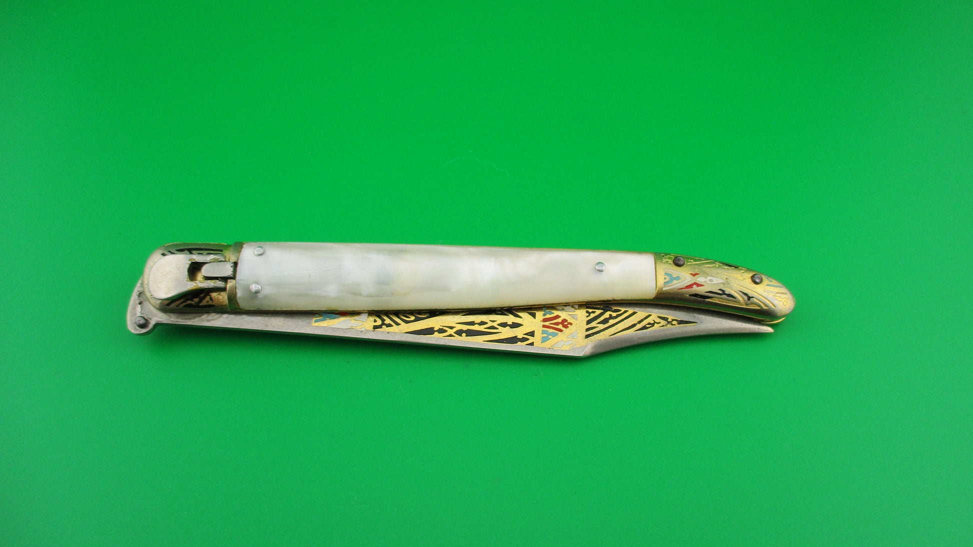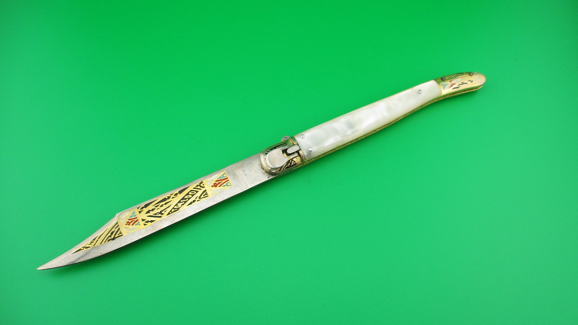 Vintage TOLEDO 24cm Spanish Pearlex Toothpick Lever Painted automatic knife most likely from the 1960s or 70s made for the tourist trade in Spain. The knife measures 23.6cm (9 5/16 inches) open with nickel silver liners, bolsters and lever. The clip blade is full with original engraving and paint and the only identifying mark is the work TOLEDO in gold within the blade decoration. The pearlex scales (handles) are gorgeous and in great condition. The knife works well with blade tip less than 1/8" above the liners closed, opens well and very good lockup. EX condition.
