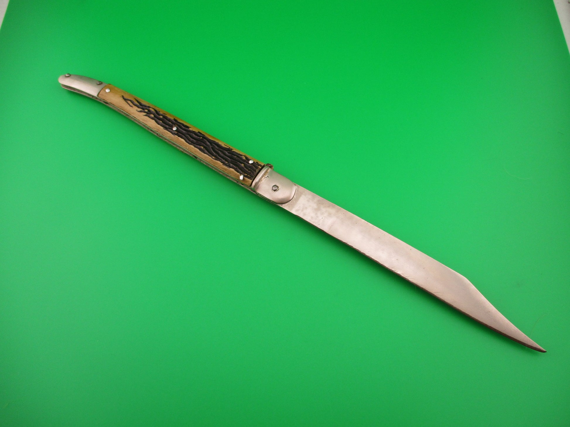 TOLEDO 30cm Spanish Toothpick Lever Faux Stag vintage automatic knife made in 1960s or 70s in Spain, likely for the tourist market. The knife measures 30.3cm (11 15/16 inches) open and 6.5 inches closed with nickel silver liners, bolsters & lever. The slip swedge blade appears to be 98% full or better with patina and some light scratches and TOLEDO stamped high on the ricasso (tang). The scales (handles) are Faux (imitation) Stag and in good condition with a couple of hairline cracks and a small piece missing near the bottom bolster that could be easily patched. The knife works well with blade tip below liners closed, opens fully with tight lockup. VG Condition.