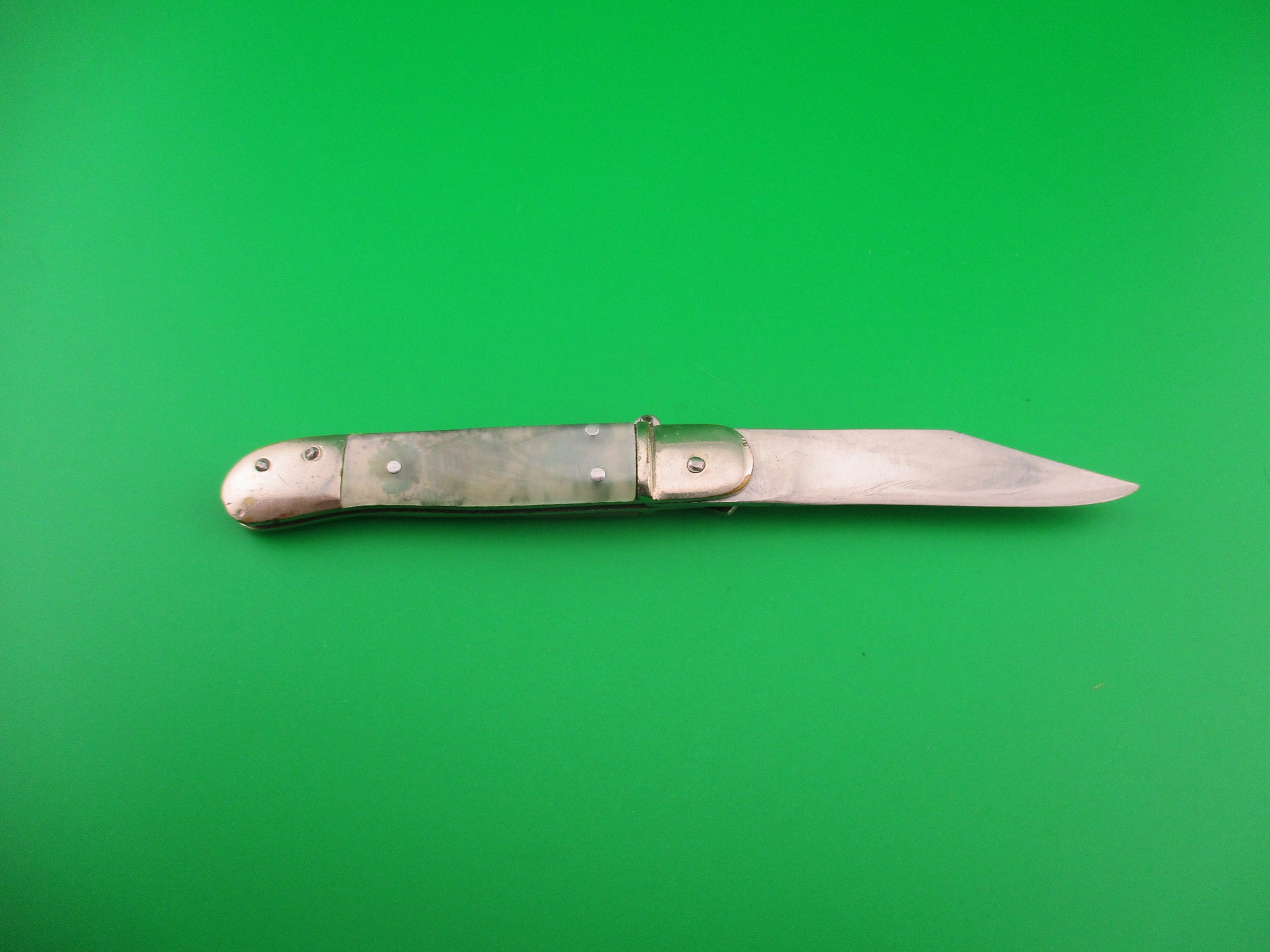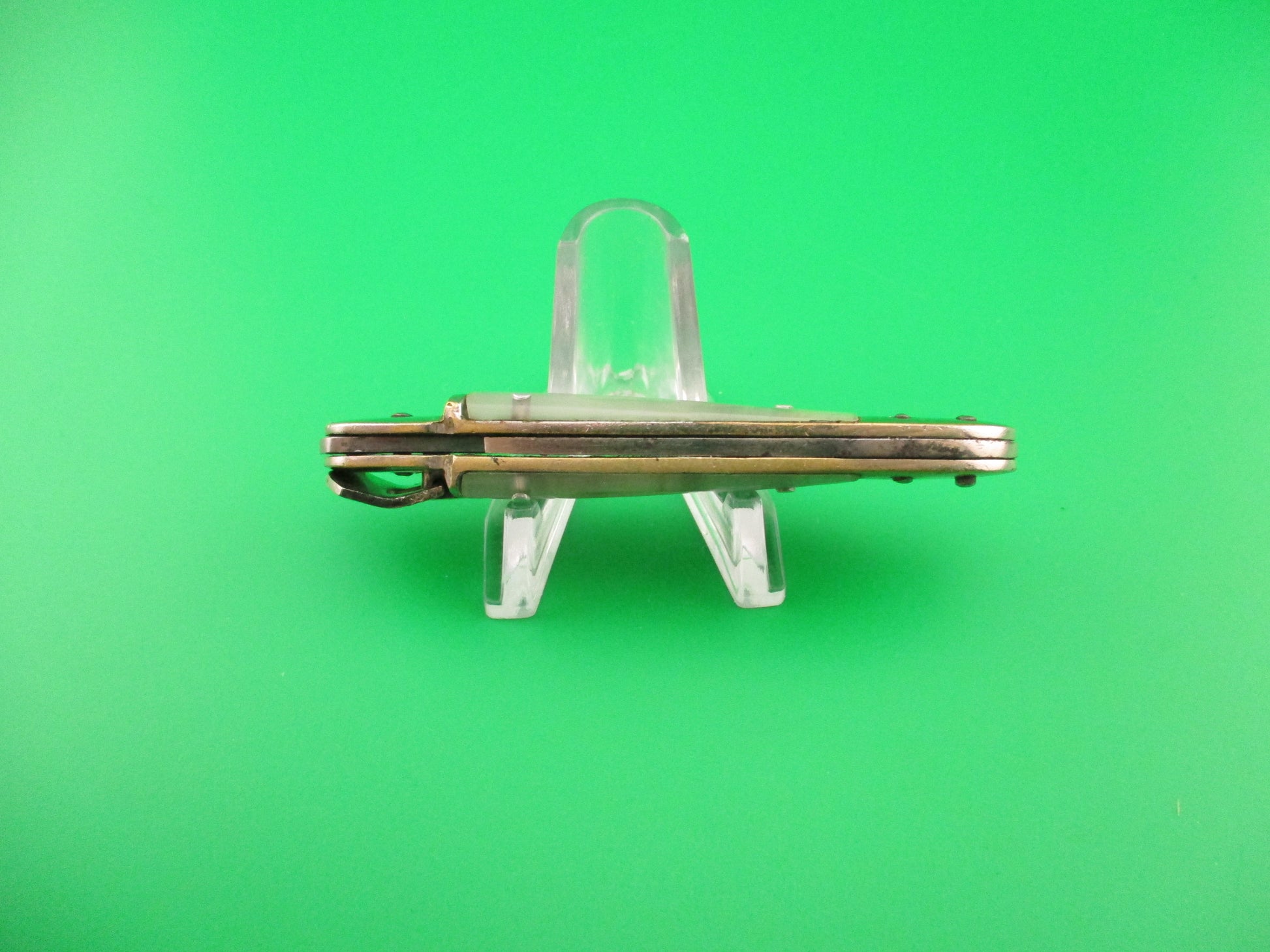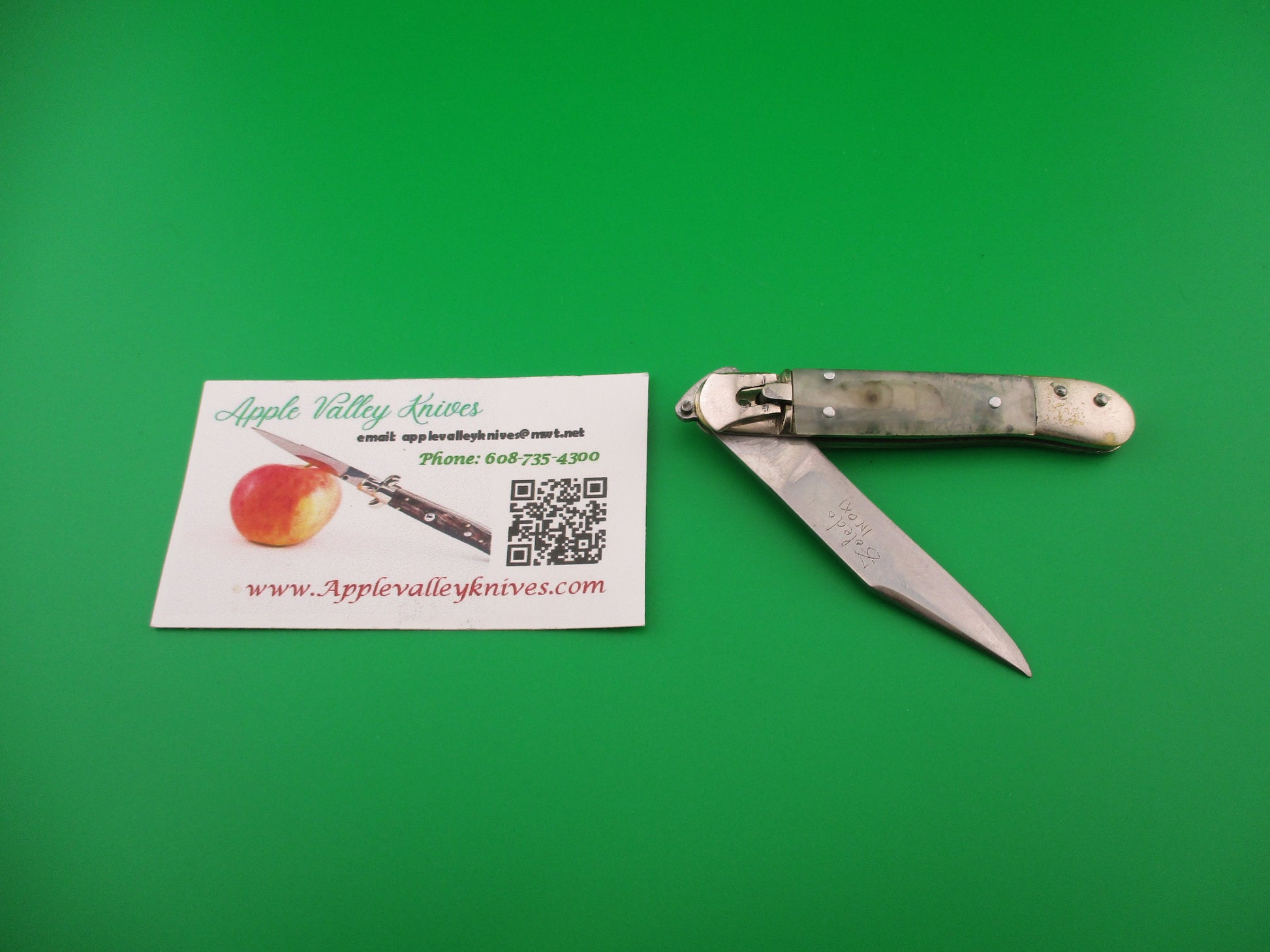 Toledo INOX 14cm Spanish Lever Souvenir 1960s vintage automatic knife made in Spain for tourist trade. This rarer size knife measures 14cm (5.5 inches) open and 3 1/8 inches closed with nickel silver plated brass liners & bolsters with steel lever. The clip swedge blade is 98% full, or better with much of the original finish with scratches and marks from "not great" sharpening and use and is hand engraved Toledo INOX on the face. The scales are translucent silver and in good condition. The knife works well with blade tip just below liners closed, good snap and tight lockup open. No rattle if shaken with blade open except for the lever. VG+ condition.