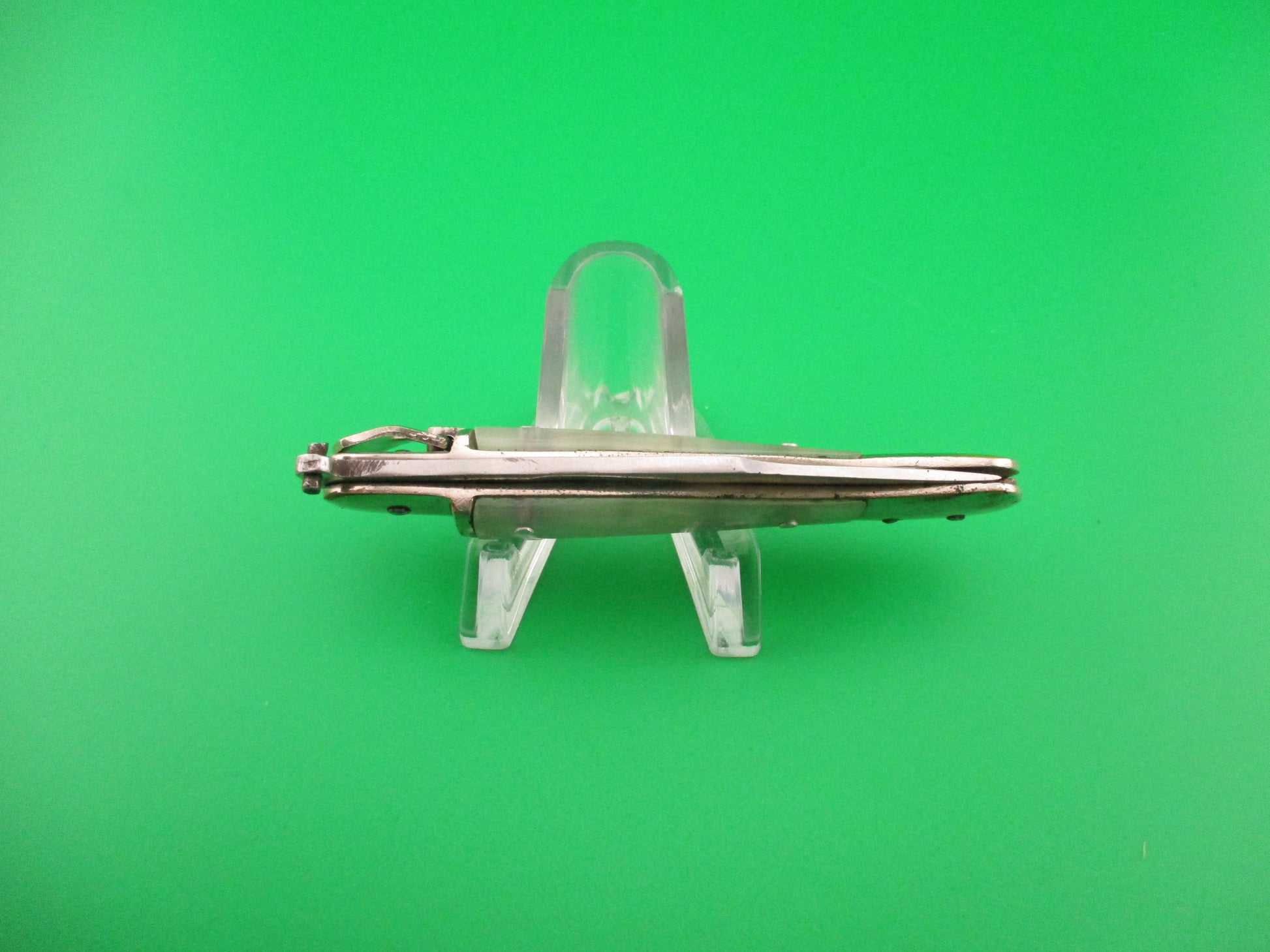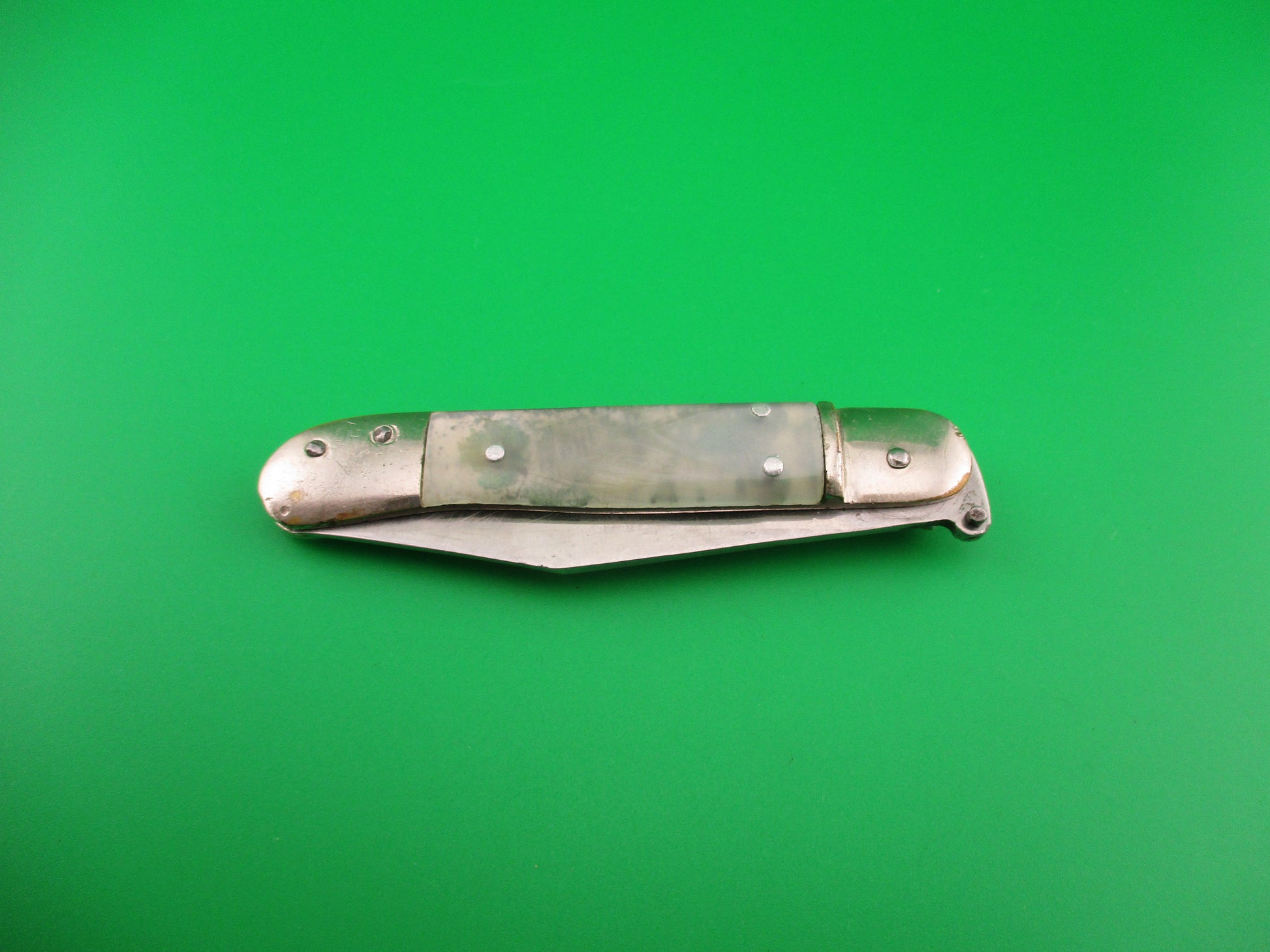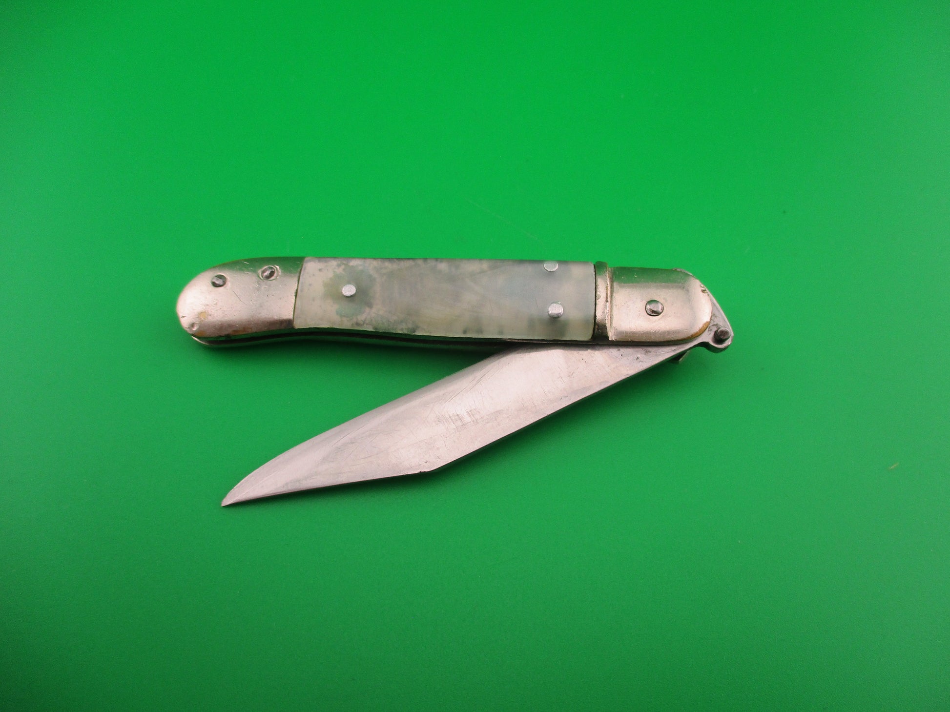 Toledo INOX 14cm Spanish Lever Souvenir 1960s vintage automatic knife made in Spain for tourist trade. This rarer size knife measures 14cm (5.5 inches) open and 3 1/8 inches closed with nickel silver plated brass liners & bolsters with steel lever. The clip swedge blade is 98% full, or better with much of the original finish with scratches and marks from "not great" sharpening and use and is hand engraved Toledo INOX on the face. The scales are translucent silver and in good condition. The knife works well with blade tip just below liners closed, good snap and tight lockup open. No rattle if shaken with blade open except for the lever. VG+ condition.