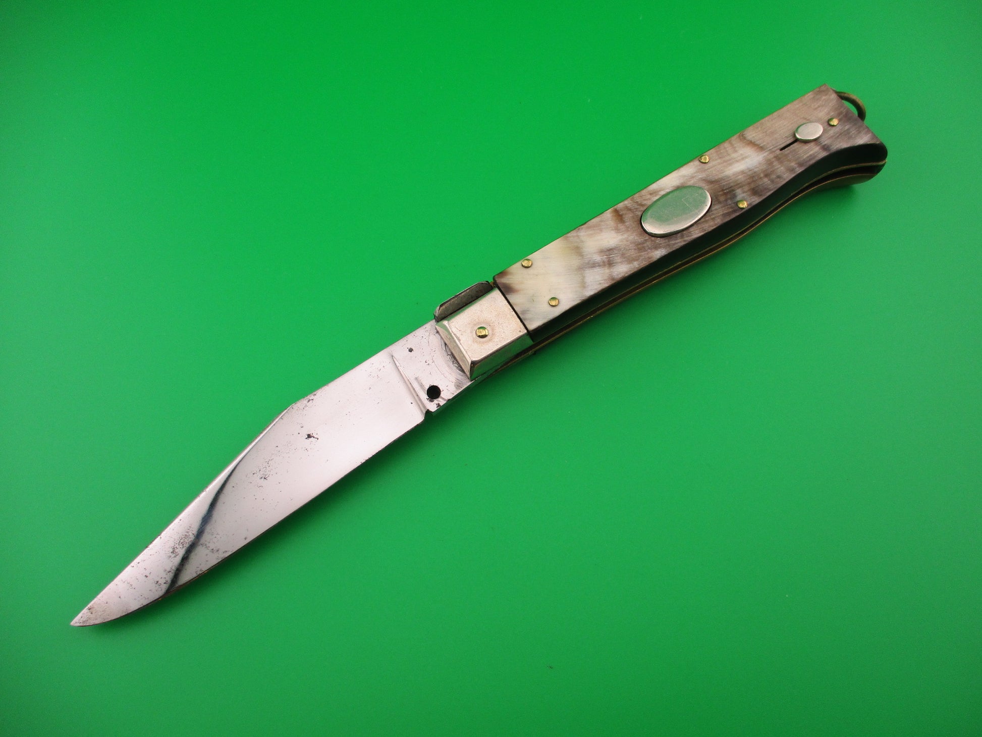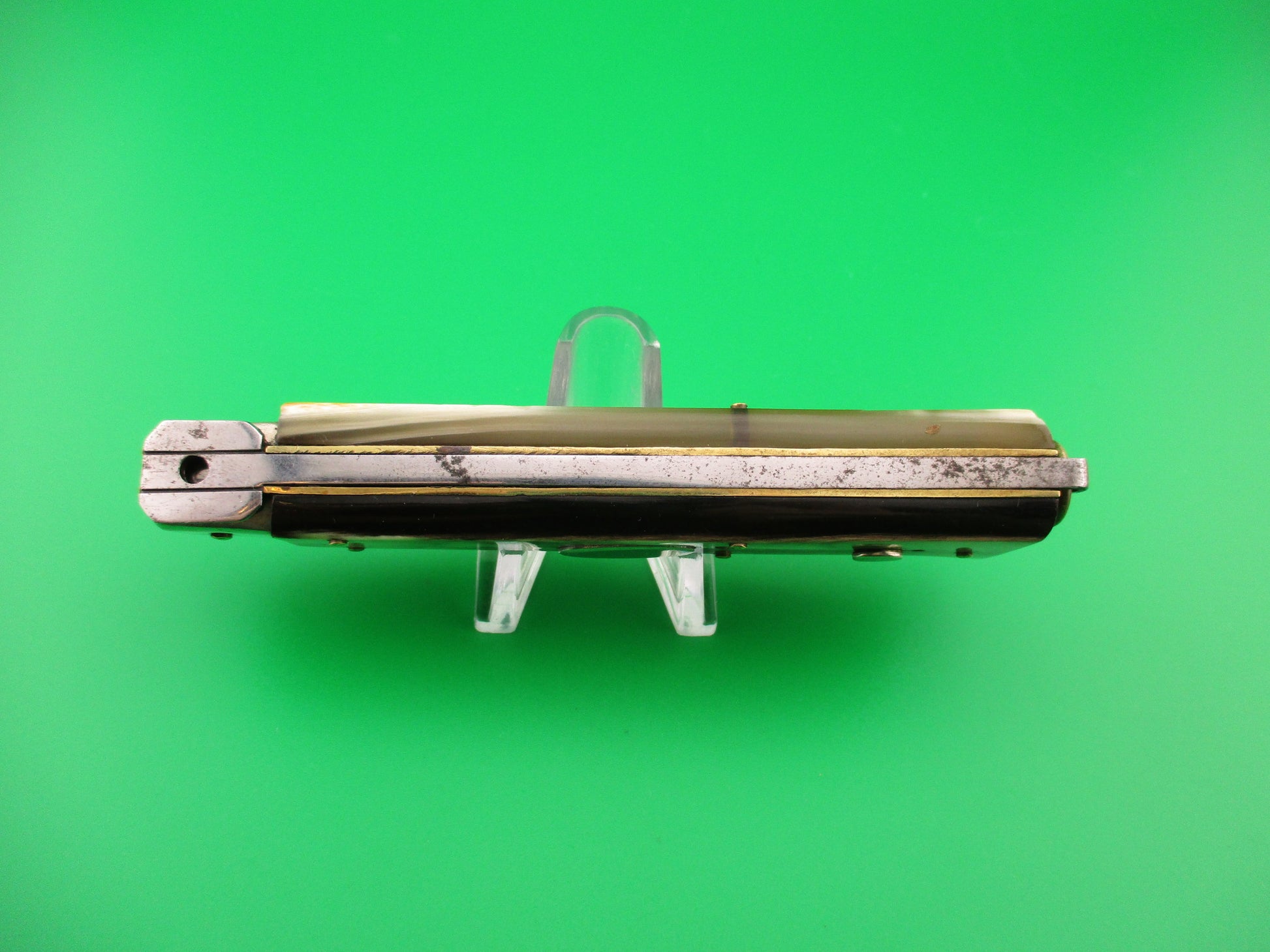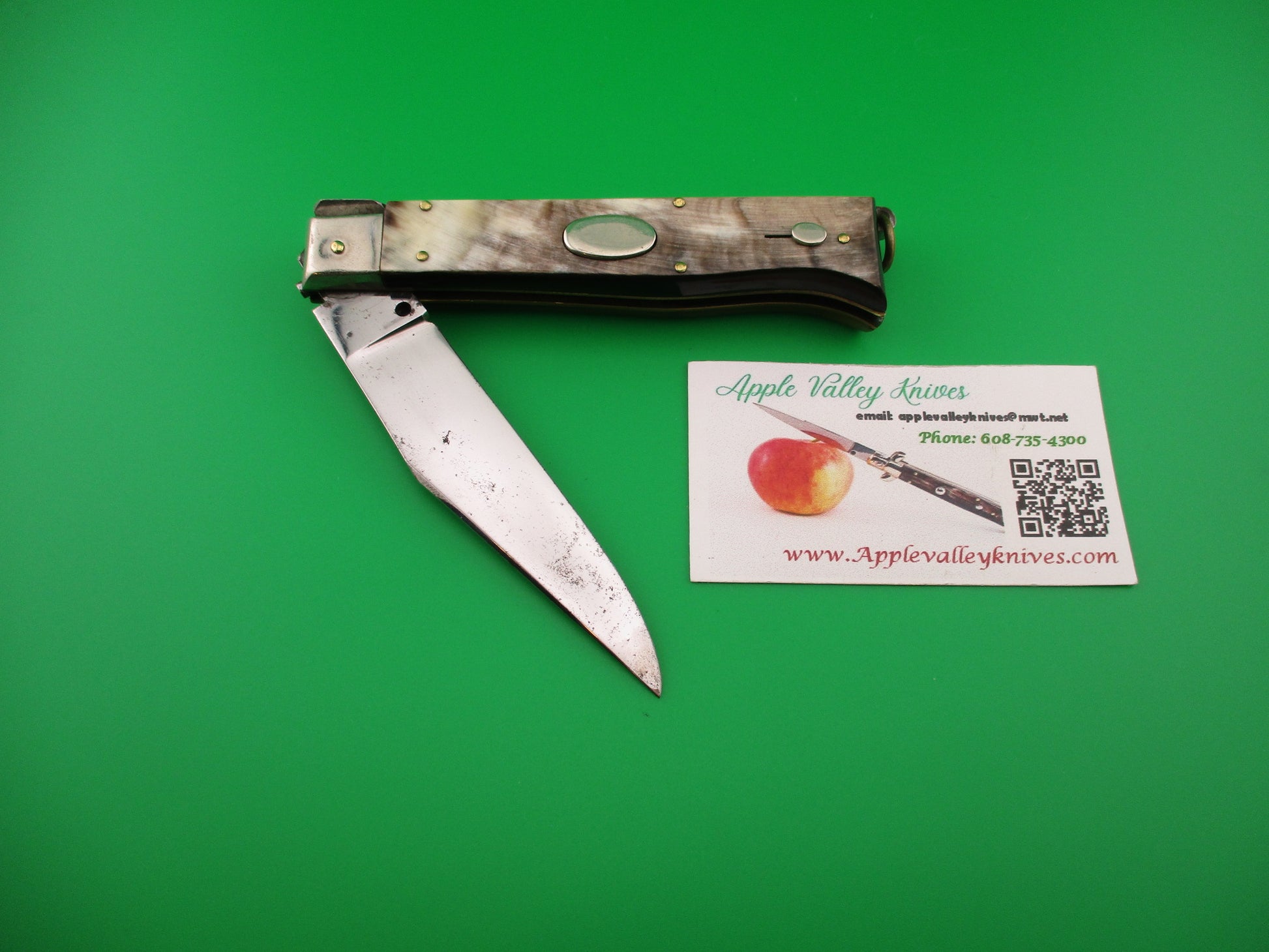 Vintage 22cm Italian Picklock Oval button Camper automatic knife made in Italy in the 1950s likely made by the same shop as the LATAMA camper that looks exactly like it. The knife measures 22cm (8 5/8 inches) open and 4 5/8 inches closed with brass liners and nickel silver bolsters, button & safety cap with brass lanyard ring. This is the larger of two different sizes of this knife that were made. The long clip blade is 100% full with original finish intact with a little light spotting and semi circle scratches on the unmarked ricasso from opening/closing. The genuine horn scales are in excellent condition and are mostly brown streaked Honey & cream in color. The knife works well with the blade tip deep & centered, STRONG SNAP and very good lockup with less than 1/32" movement at the tip open. Slight rattle if shaken with blade open as most do. Safety works. EX condition.