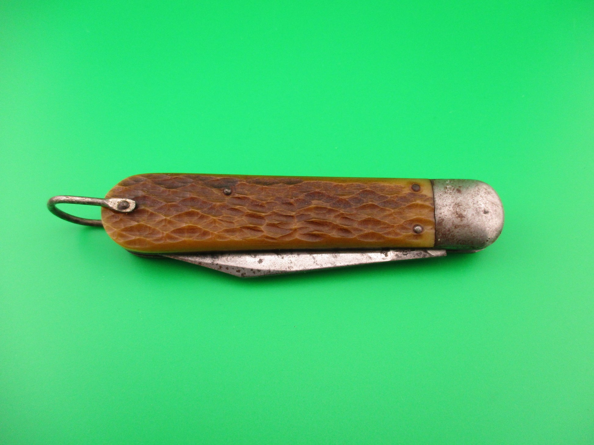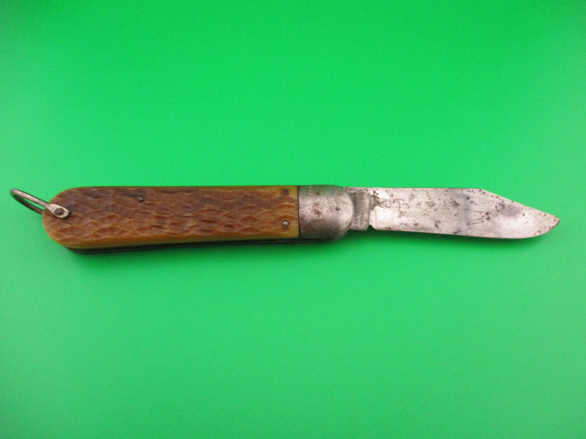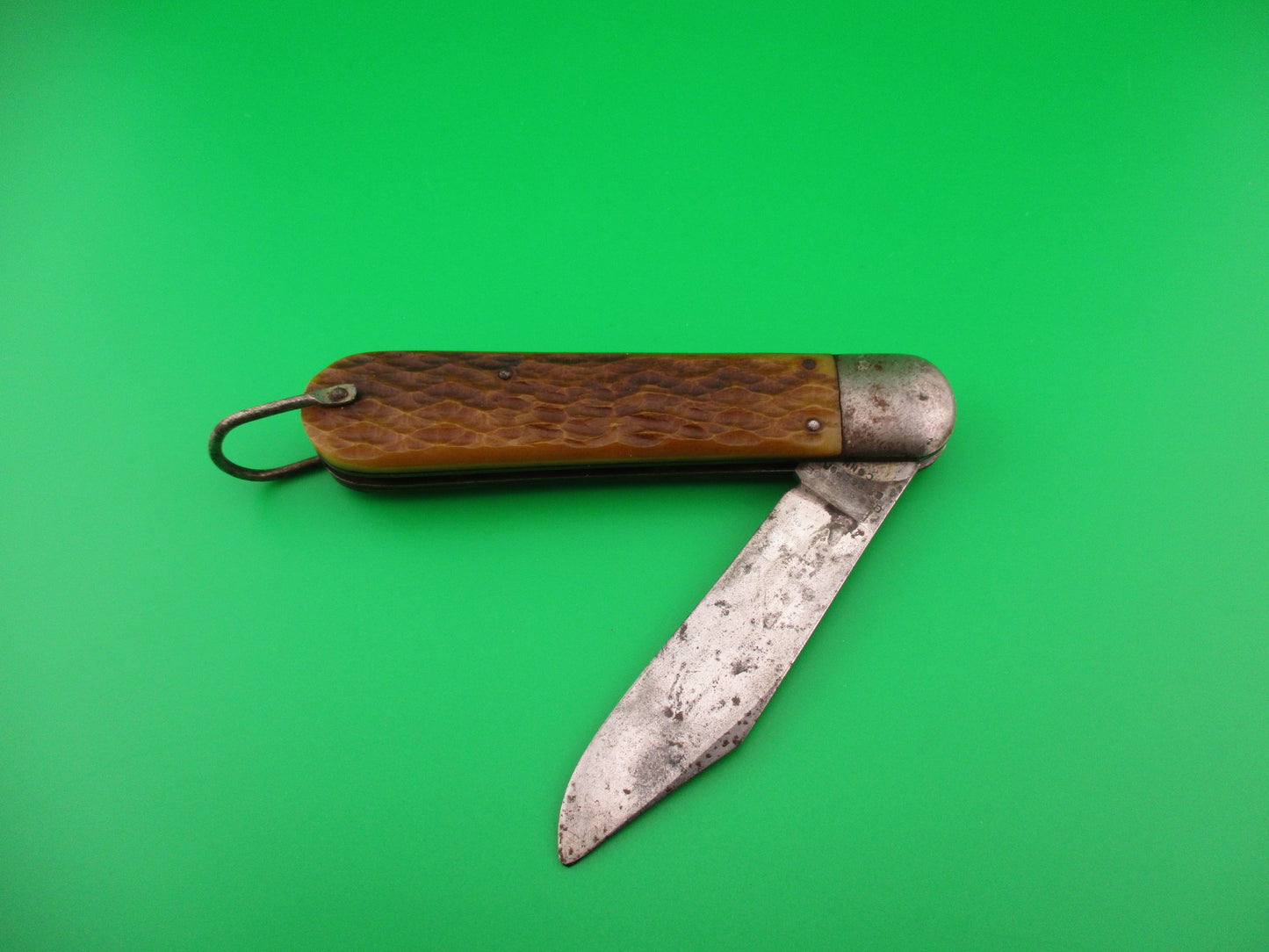 Vintage PRESTO BOY SCOUTS OF AMERICA automatic knife made for scouts with disabilities in the 1940s by the George Schrade Knife Co of Bridgeport, CT. The really COOL thing about this knife is you can clearly see the word "AMERICA" etched on the blade as well as "OF" and part of "BOY" if you look very closely, though the rest of the original etch was lost to poor sharpening over the years and possibly removed intentionally. The original etch read: BOY SCOUTS OF AMERICA with the scout symbol in the middle as you can see in the last picture which is of another knife to show what the etch looked like originally. This is a REAL DEAL Boy Scout switchblade knife from the 1940s!