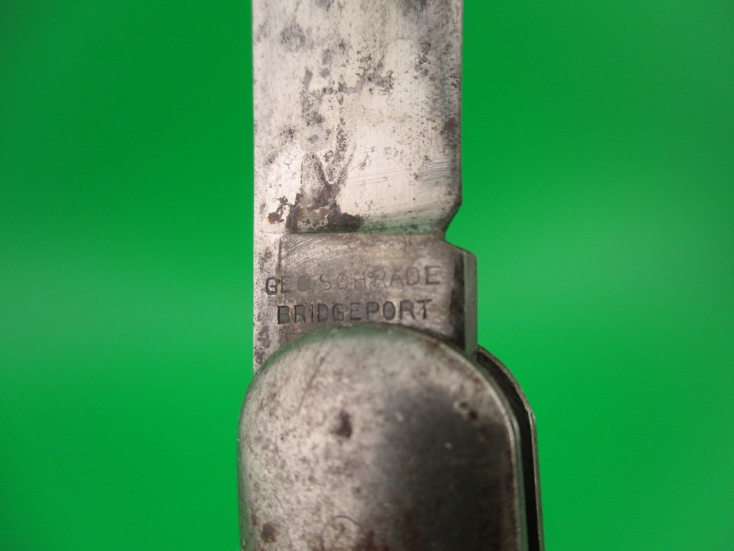 The knife measures 4 1/8 inches closed and 7 inches open with steel liners, bolsters, button & safety. The clip blade is mostly full at about 96% with a lot of scratches, spotting and a tiny bit of the tip was broken off a long time ago. The tang is stamped PRESTO MADE IN USA and the reverse is stamped GEO SCHRADE BRIDGEPORT, CONN. The jigged bone scales are in excellent condition. The knife works well with the blade tip deep and centered in the well, opens fully and good lockup with about 1/16" up and down at the tip. This is basically the same knife as the M2 Paratrooper made by Presto for the US military during WWII, but those did not have any etches on the blades. Safety works. VG+ condition.