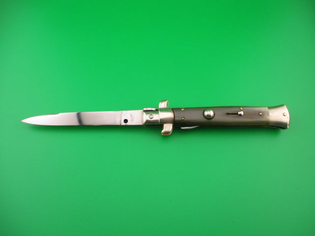 WANDY INOX 23cm Italian Stiletto Vintage swivel bolster switchblade knife made in Italy 1970s most likely. It measures 22.5cm (8 13/16 inches) open and 4 7/8 inches closed with brass liners and nickel silver bolsters, button and safety. Flat grind swedge blade is 97% full with original finish with light scratches and is stamped WANDY over INOX on the ricasso (tang). Genuine horn scales mostly green with a little cream and black edges and in good condition. Spring protrudes above liners when closed. Function is good with blade tip below the liners and centered, strong snap and tight lockup. No rattle if shaken with blade open. Safety works. VG+ condition.